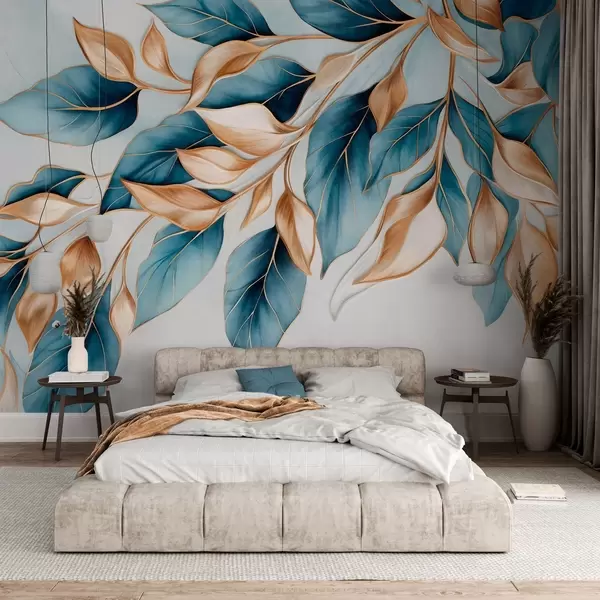 Fotomurales Hojas azules y naranjas con textura, fondo azul claro, diseño elegante y artístico, estilo moderno. Nr. w09429