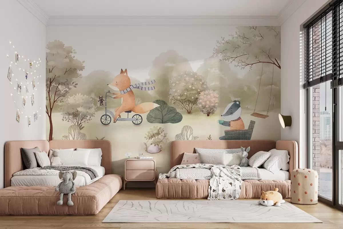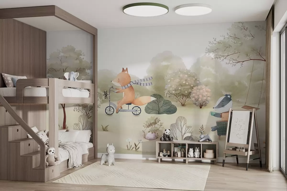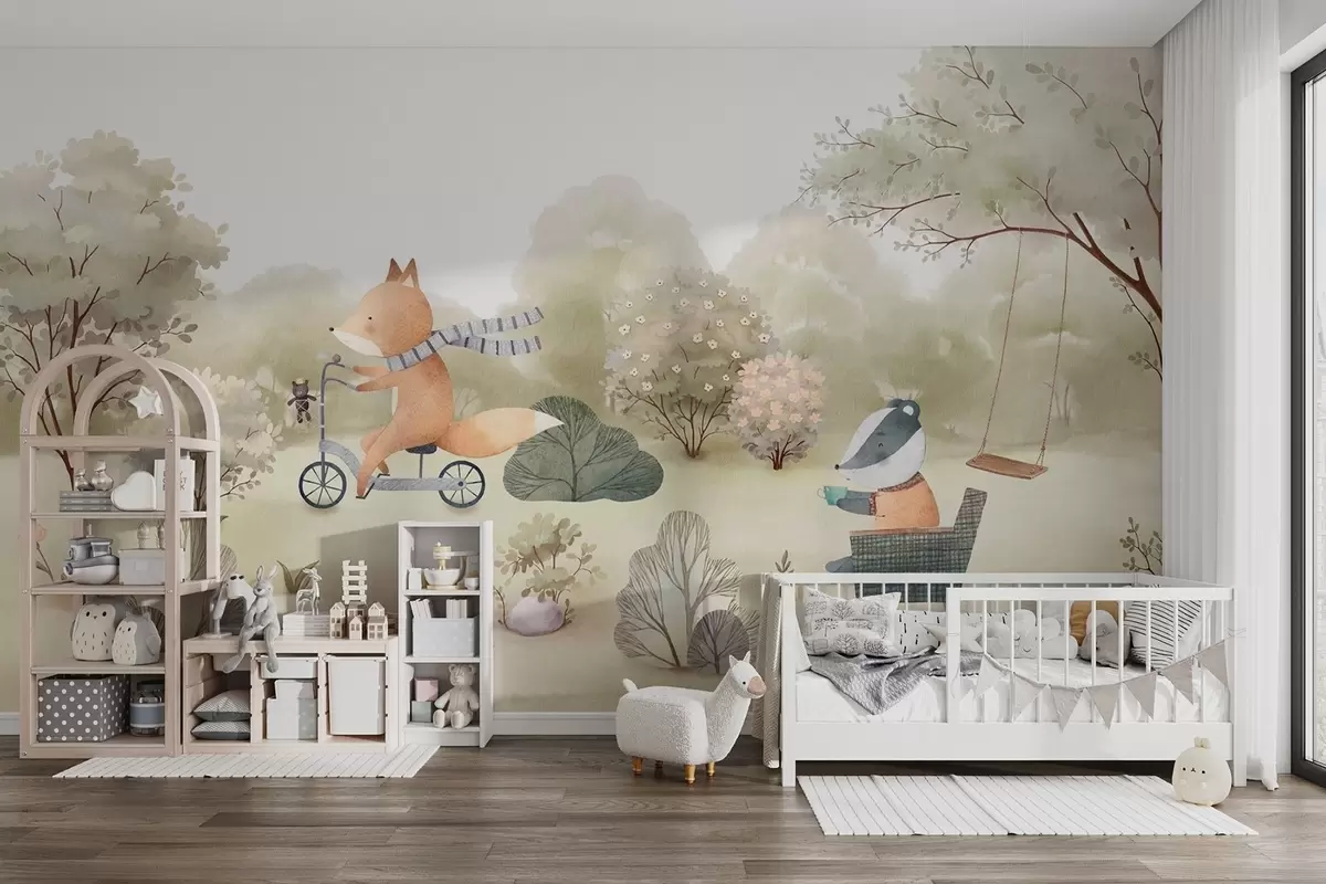 Fotomurales Zorro en bicicleta y tejón con té, animales del bosque en estilo acuarela Nr. w09439