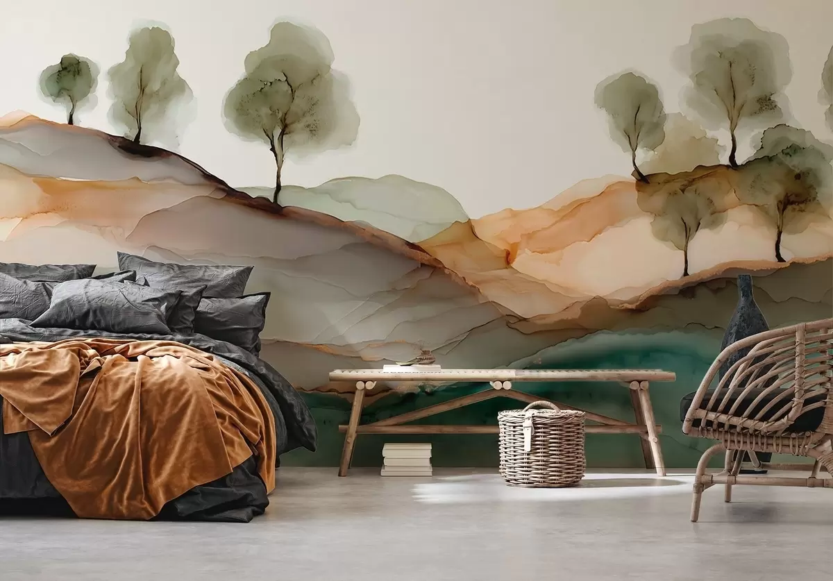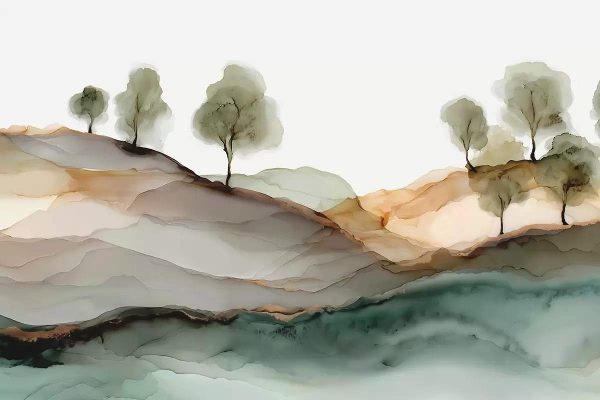 Fotomurales Paisaje abstracto en estilo tinta alcohólica: colinas y árboles en tonos pastel. Nr. w09457