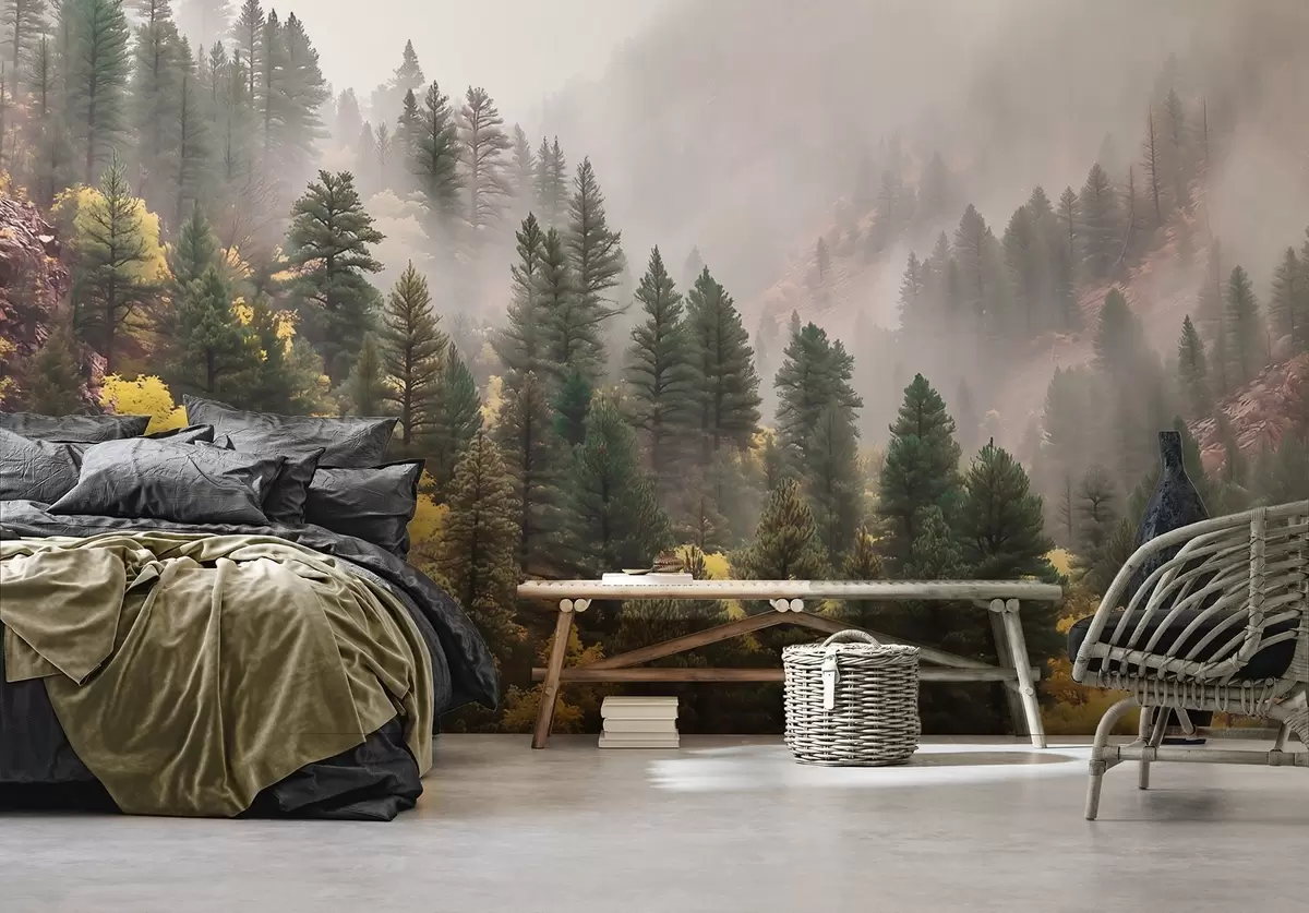 Fotomurales Bosque de pinos brumoso y evocador en las montañas Nr. w09463
