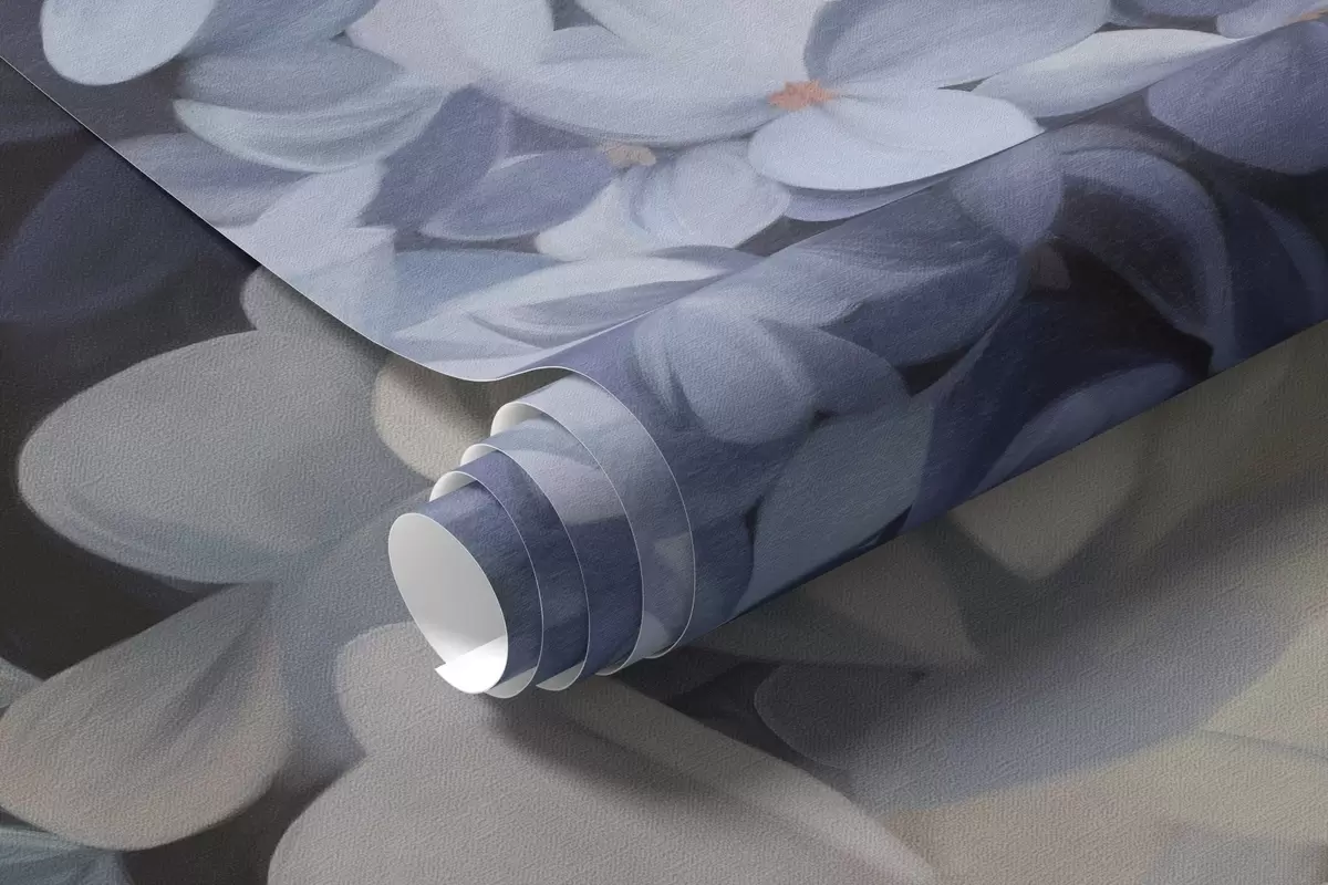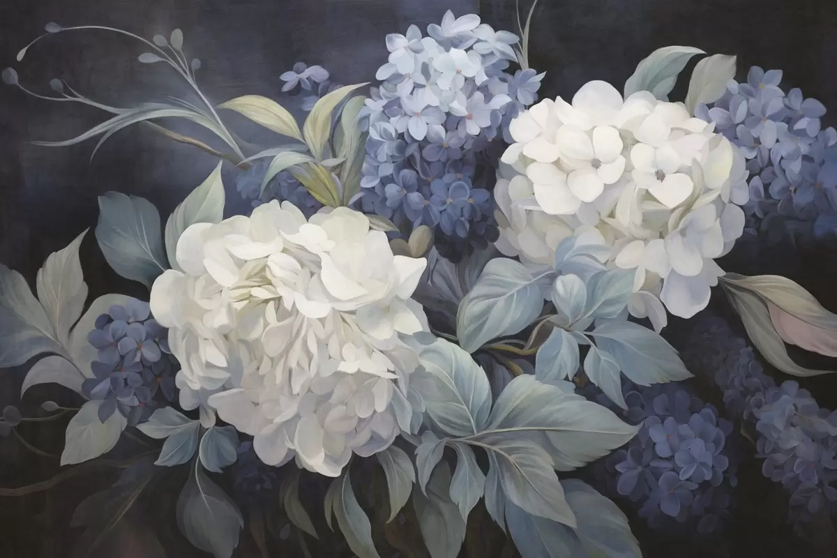 Fotomurales Pintura texturizada en azul oscuro imitando flores de hortensias con hojas grandes, fondo abstracto y oscuro Nr. w09465v1