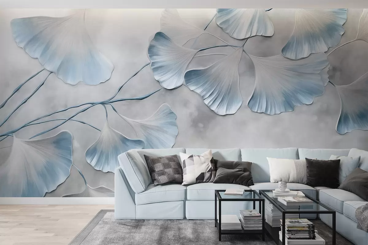 Fotomurales Hojas de ginkgo biloba con bordes azules en una rama, fondo gris texturizado, diseño elegante y minimalista Nr. w09472v1