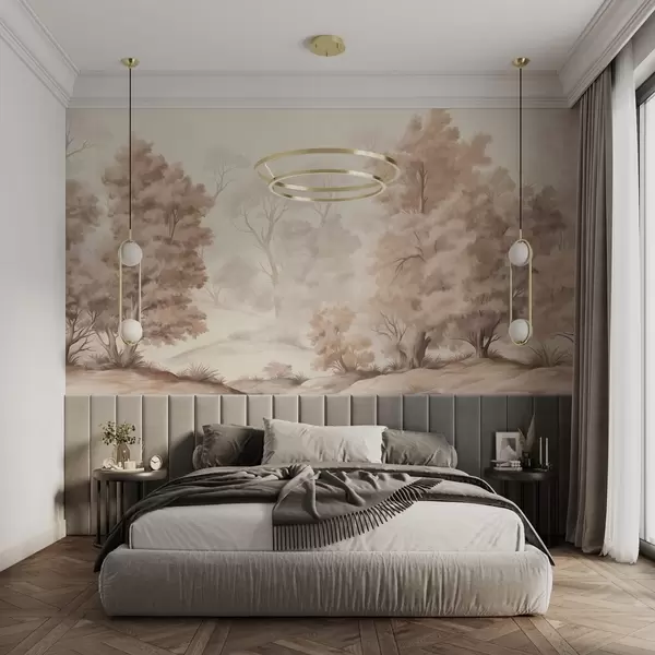 Fotomurales Pintura paisajística texturizada que imita un bosque con árboles altos y hierba, colores apagados y suaves, escena relajante Nr. w09474