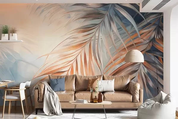 Fotomurales Hojas de palmera con tonos naranjas y azules, fondo con textura ligera y colores suaves, elegante estilo tropical Nr. w09475