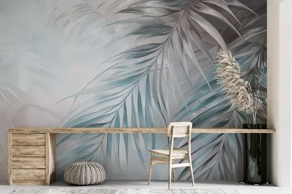 Fotomurales Hojas de palmera con tonos grises y azules, fondo con textura ligera y colores suaves, elegante estilo tropical Nr. w09475v1