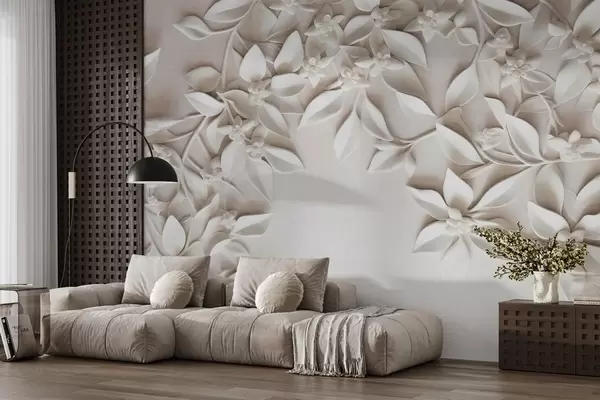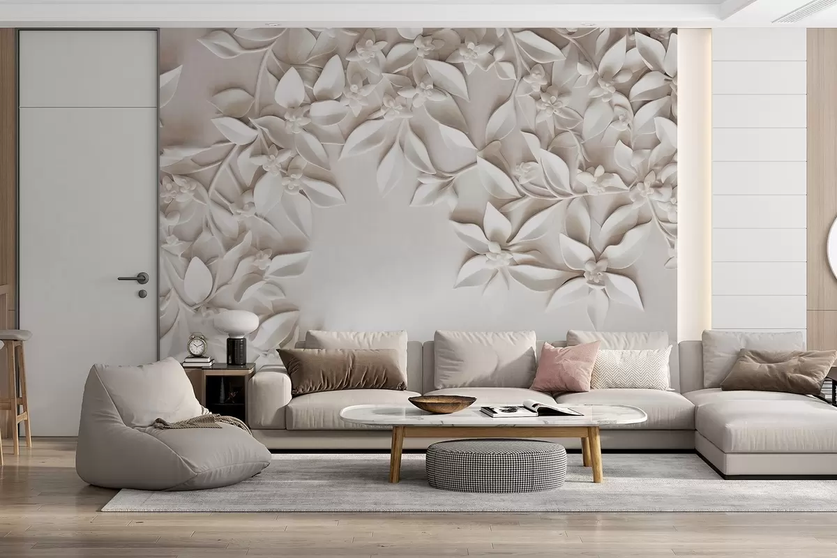 Fotomurales Flores y hojas blancas con textura, arreglo floral, diseño elegante, estilo minimalista, arte decorativo Nr. w09479