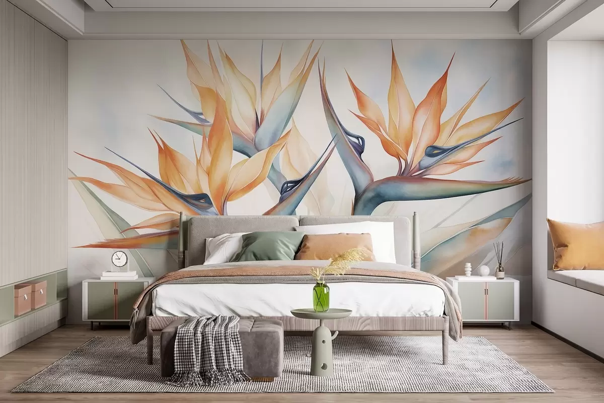 Fotomurales Flor del ave del paraíso, strelitzia con pétalos naranjas, estilo texturizado en acuarela suave, fondo claro Nr. w09483