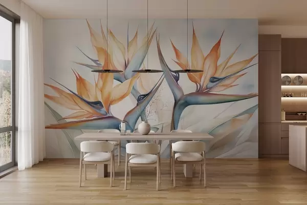 Fotomurales Flor del ave del paraíso, strelitzia con pétalos naranjas, estilo texturizado en acuarela suave, fondo claro Nr. w09483