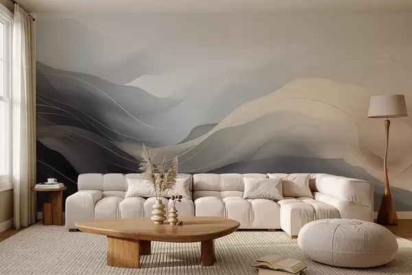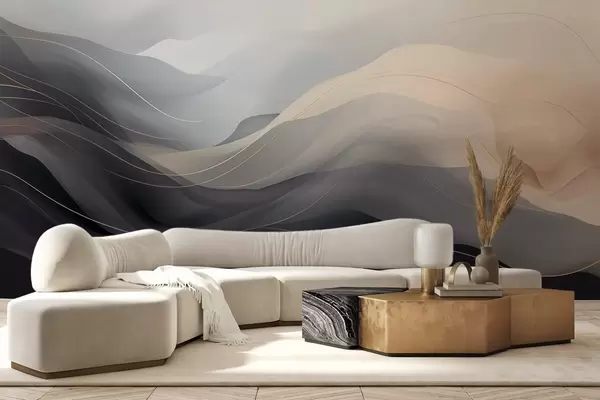 Fotomurales Olas abstractas y brumosas en tonos grisáceos y crema con líneas amarillas. Nr. w09504