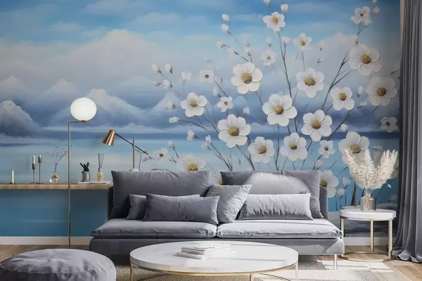 Fotomurales Flores blancas primaverales junto a un lago helado con montañas nevadas, pintadas al óleo. Nr. w09526
