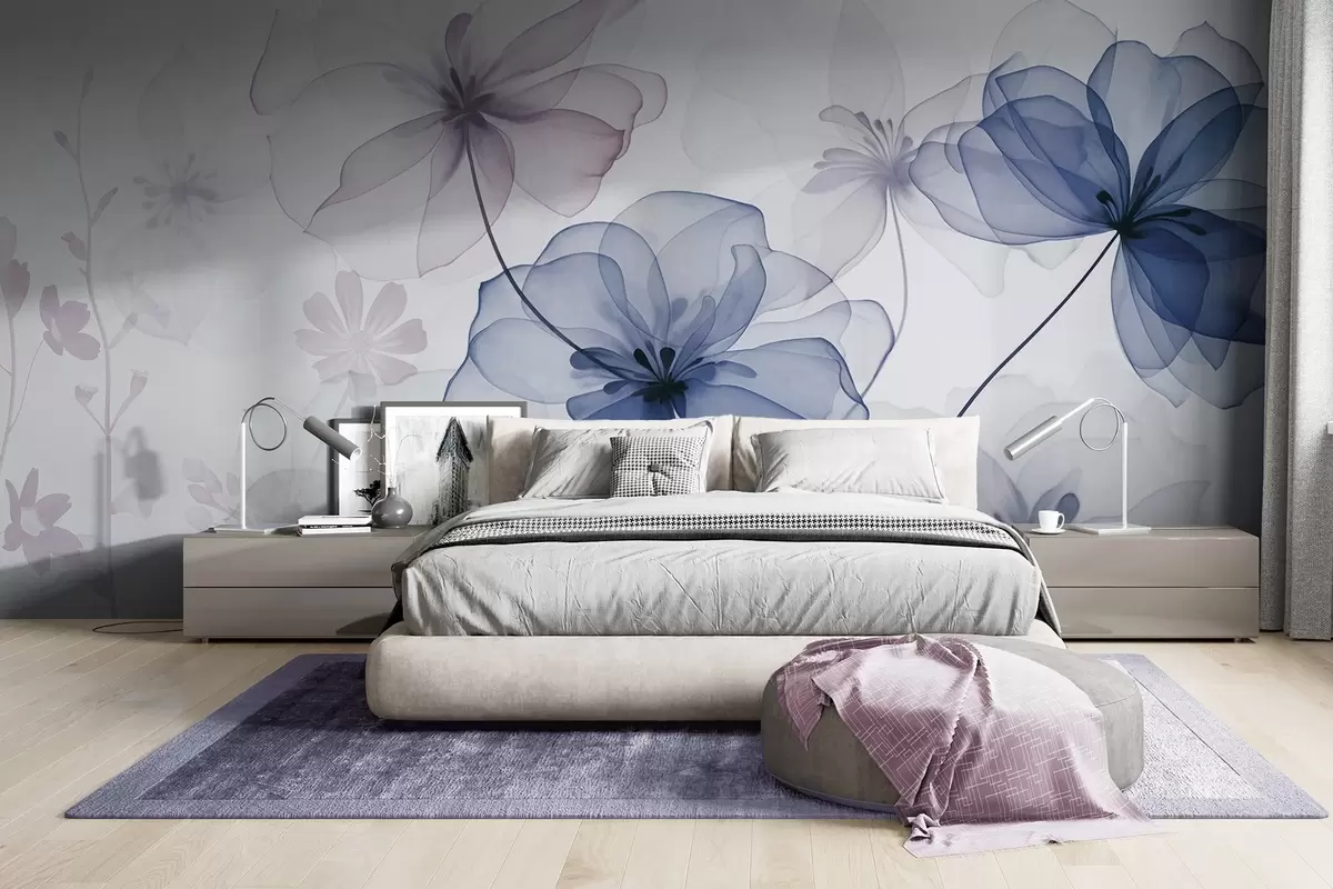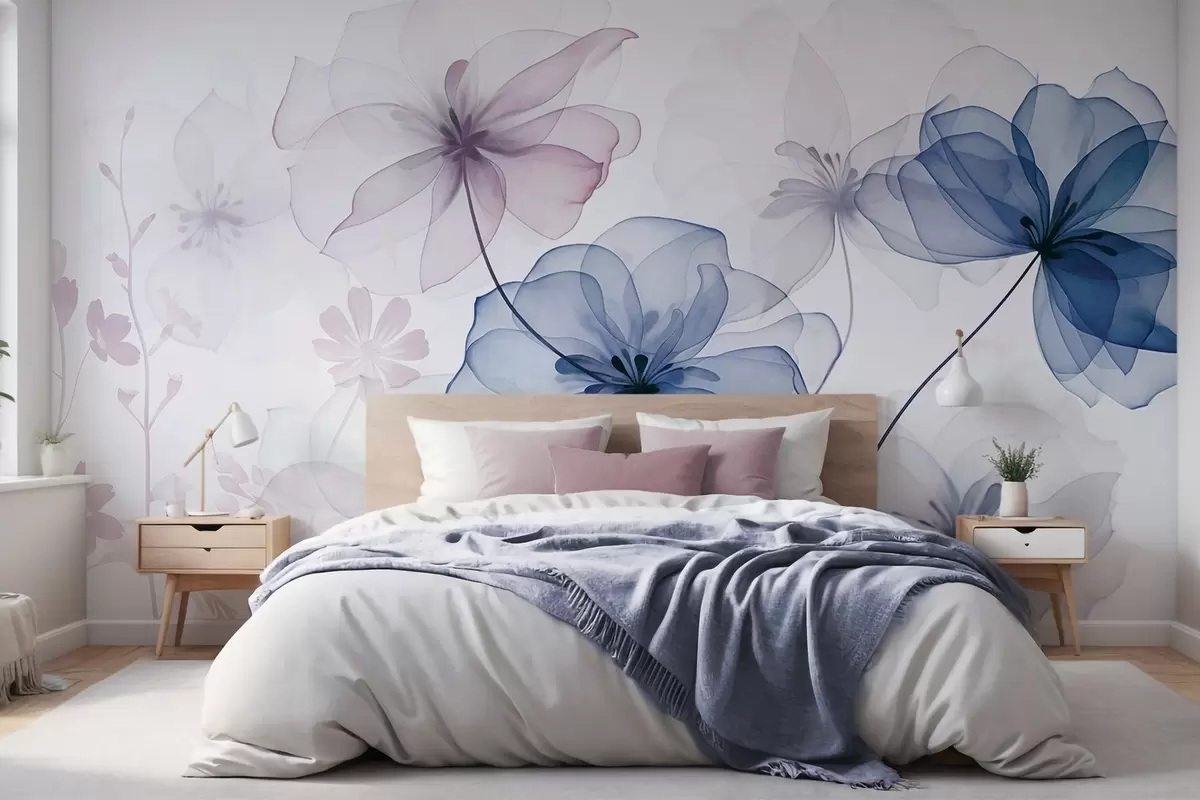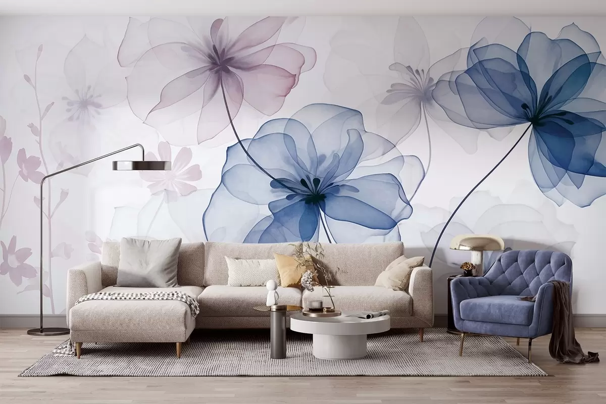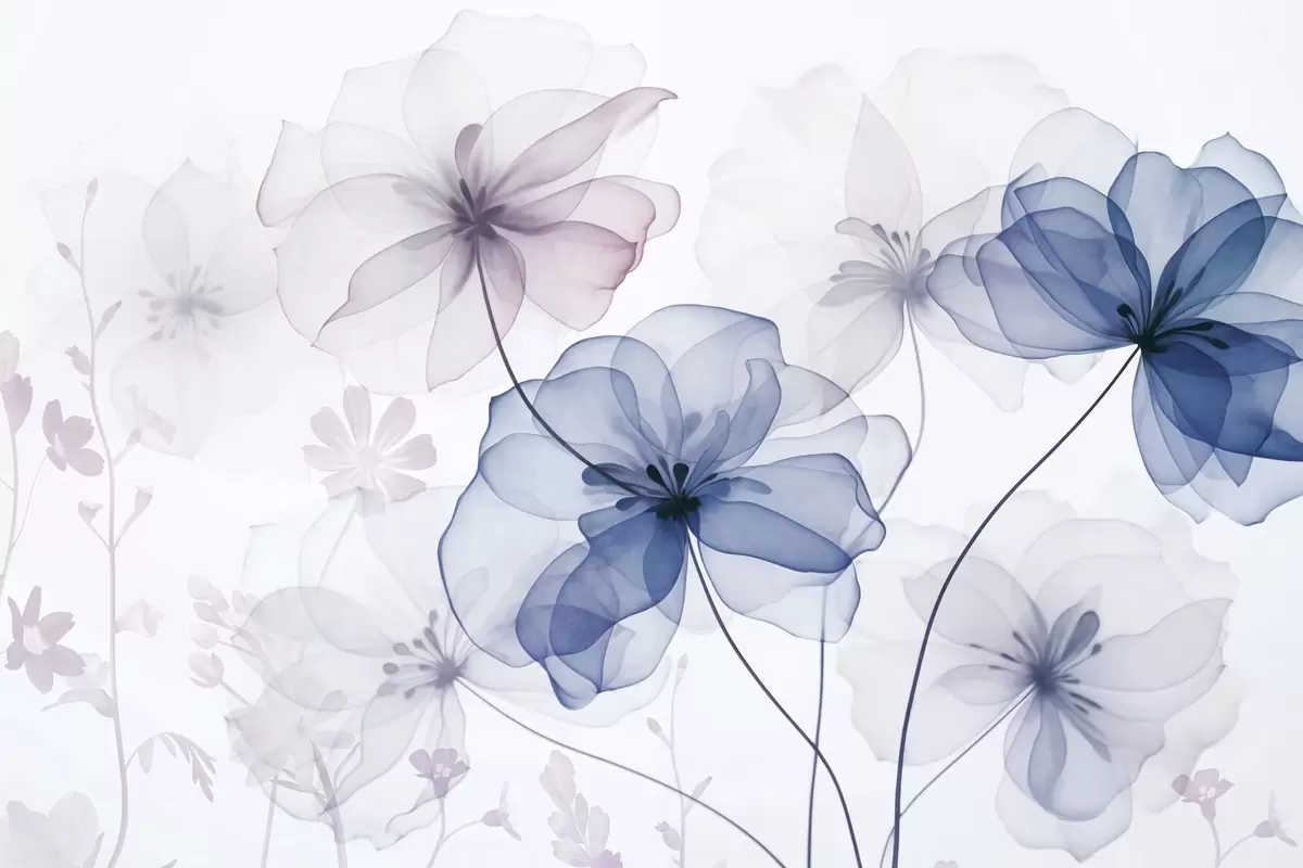 Fotomurales Flores translúcidas con pétalos de tonos azules y rosados apagados, tallos largos, fondo claro, colores suaves y diseño floral con textura. Nr. w09529v1