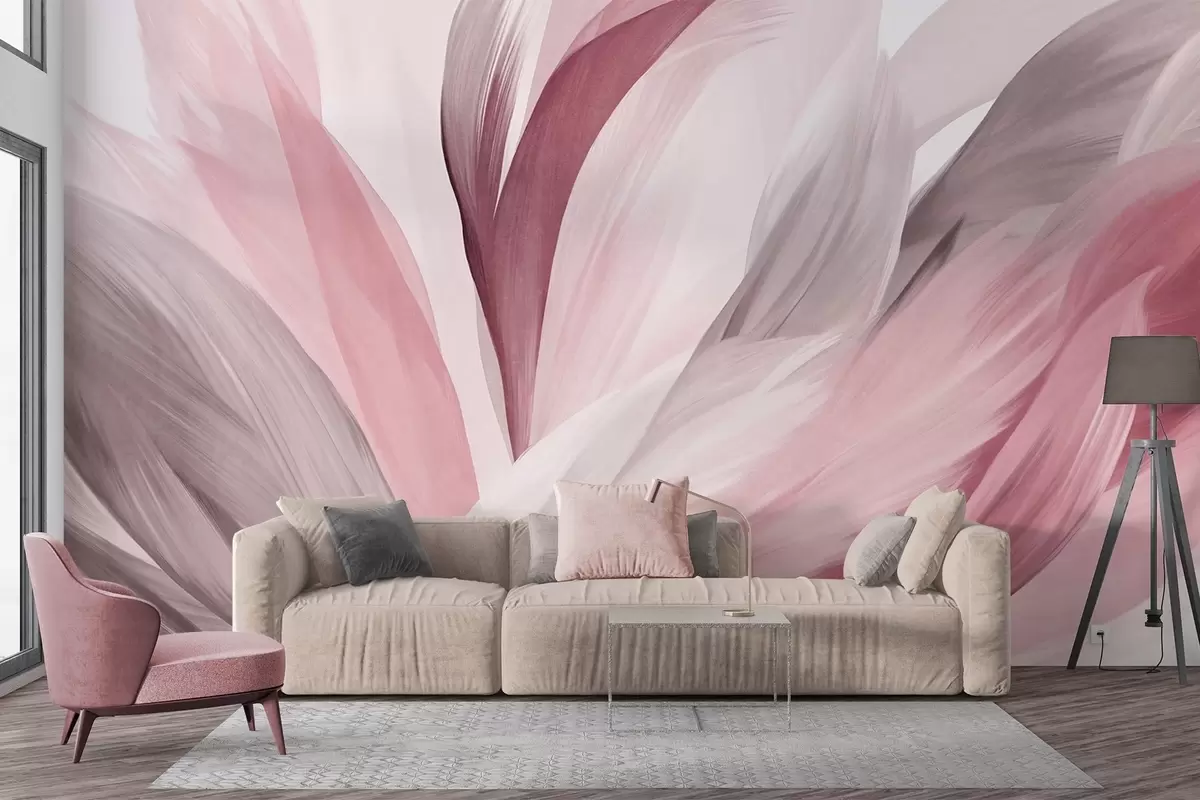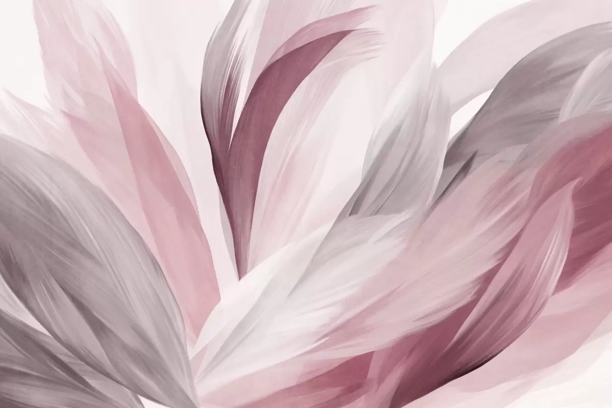 Fotomurales Plumas abstractas con textura en rosa, blanco y gris y varios tonos, superpuestas sobre un fondo blanco. Nr. w09531v2