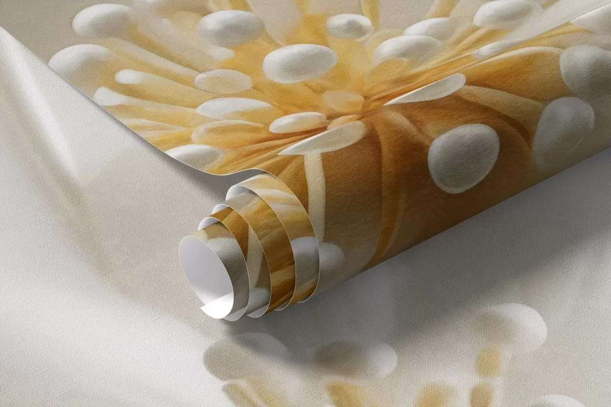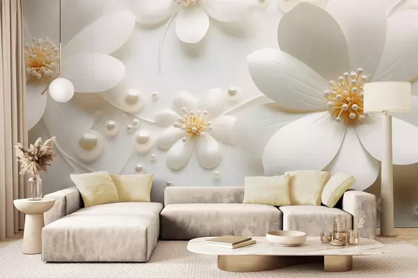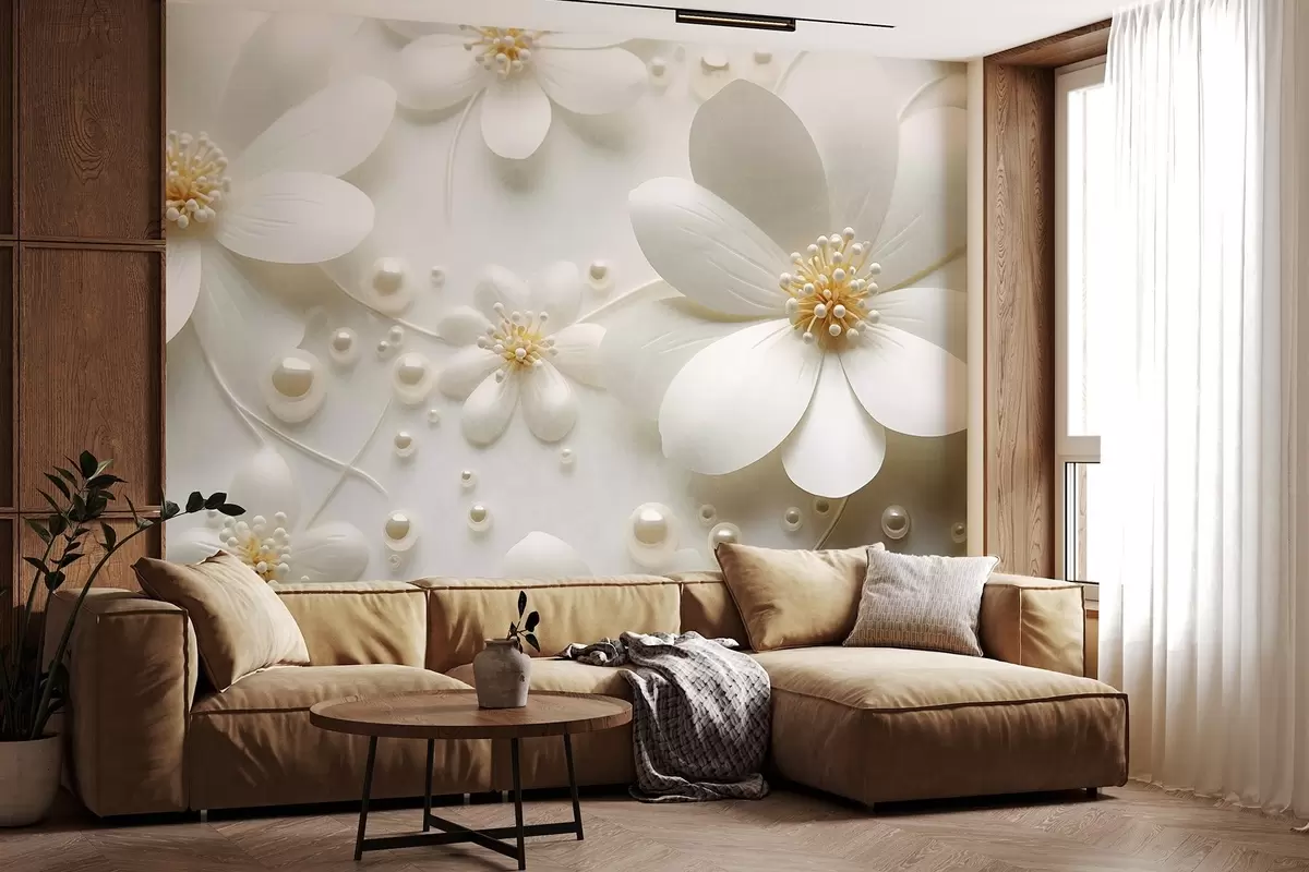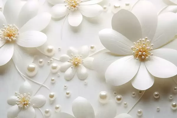 Fotomurales Flores blancas con perlas esparcidas sobre un fondo blanco, diseño elegante y minimalista, con textura. Nr. w09535