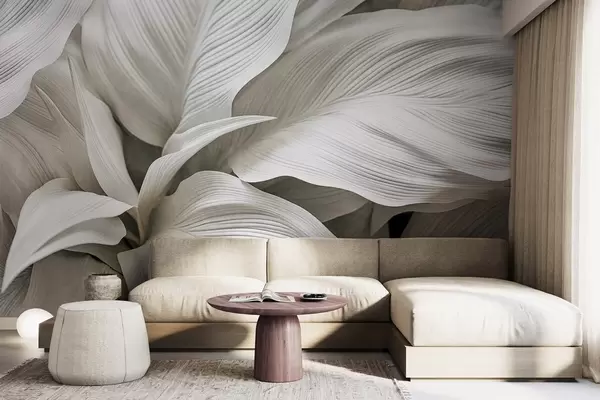 Fotomurales Hojas grandes, blancas y texturizadas, con nervaduras prominentes que se superponen y crean profundidad. Nr. w09536