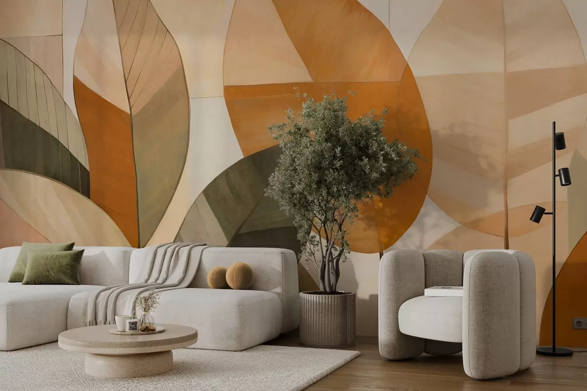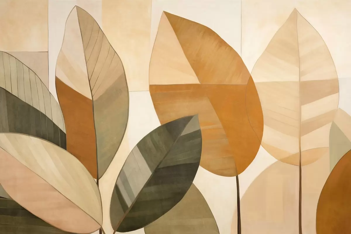 Fotomurales Hojas abstractas grandes en tonos naranjas, marrones y verdes, con textura, dispuestas sobre un fondo claro. Nr. w09539