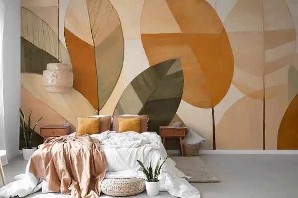 Fotomurales Hojas abstractas grandes en tonos naranjas, marrones y verdes, con textura, dispuestas sobre un fondo claro. Nr. w09539