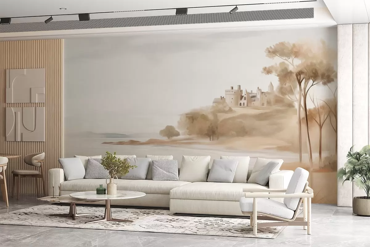 Fotomurales Paisaje con un castillo en una colina cerca del mar, una playa de arena en primer plano, colores apagados, arte texturizado. Nr. w09540