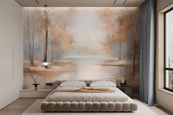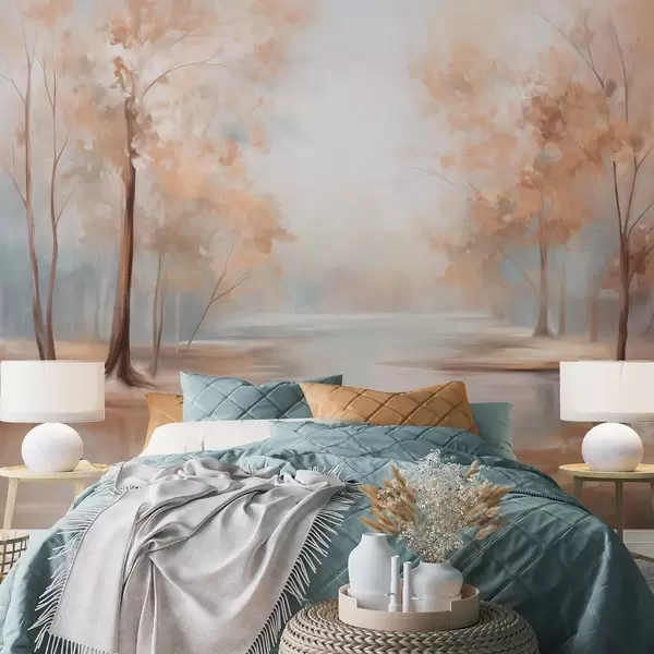 Fotomurales Paisaje otoñal con árboles y un río, colores suaves, atmósfera ligera y aireada, escena pacífica y tranquila. Nr. w09541