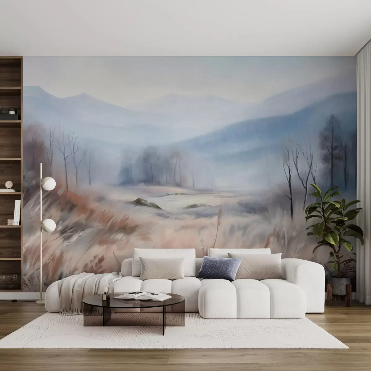 Fotomurales Paisaje con textura, con hierba seca en primer plano y árboles al fondo, con montañas en la distancia. Nr. w09542