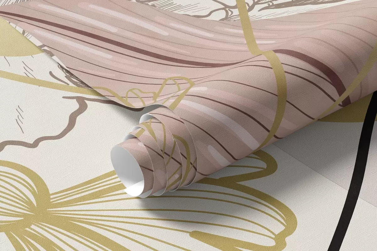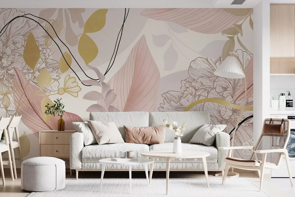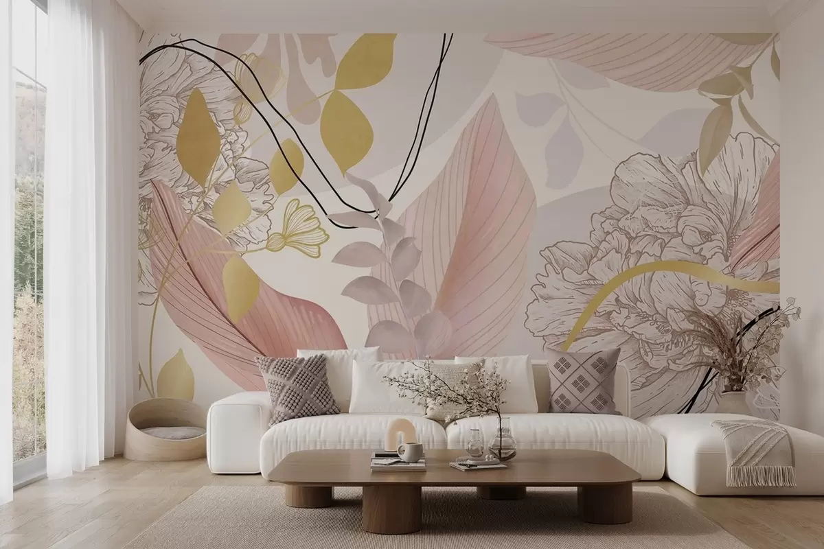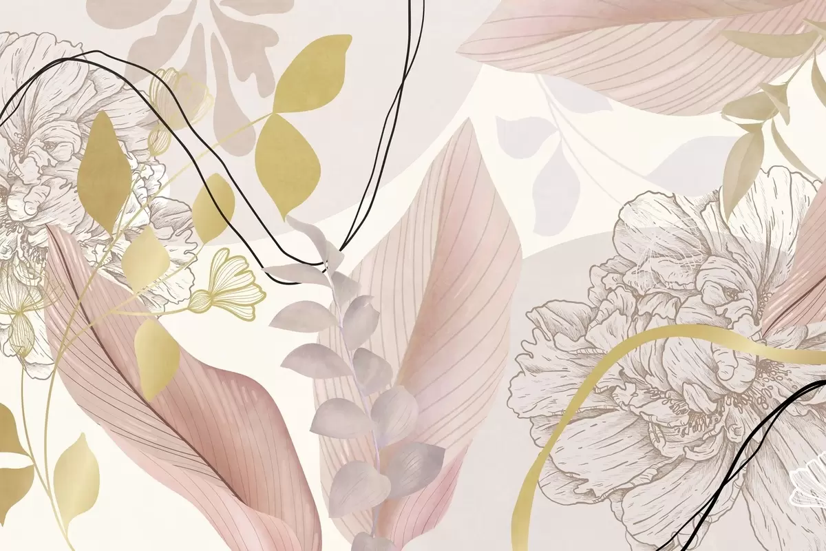 Fotomurales Estampado floral abstracto con hojas grandes en tonos rosa apagado, amarillo con finas líneas negras y contornos florales blancos. Nr. w09544v1