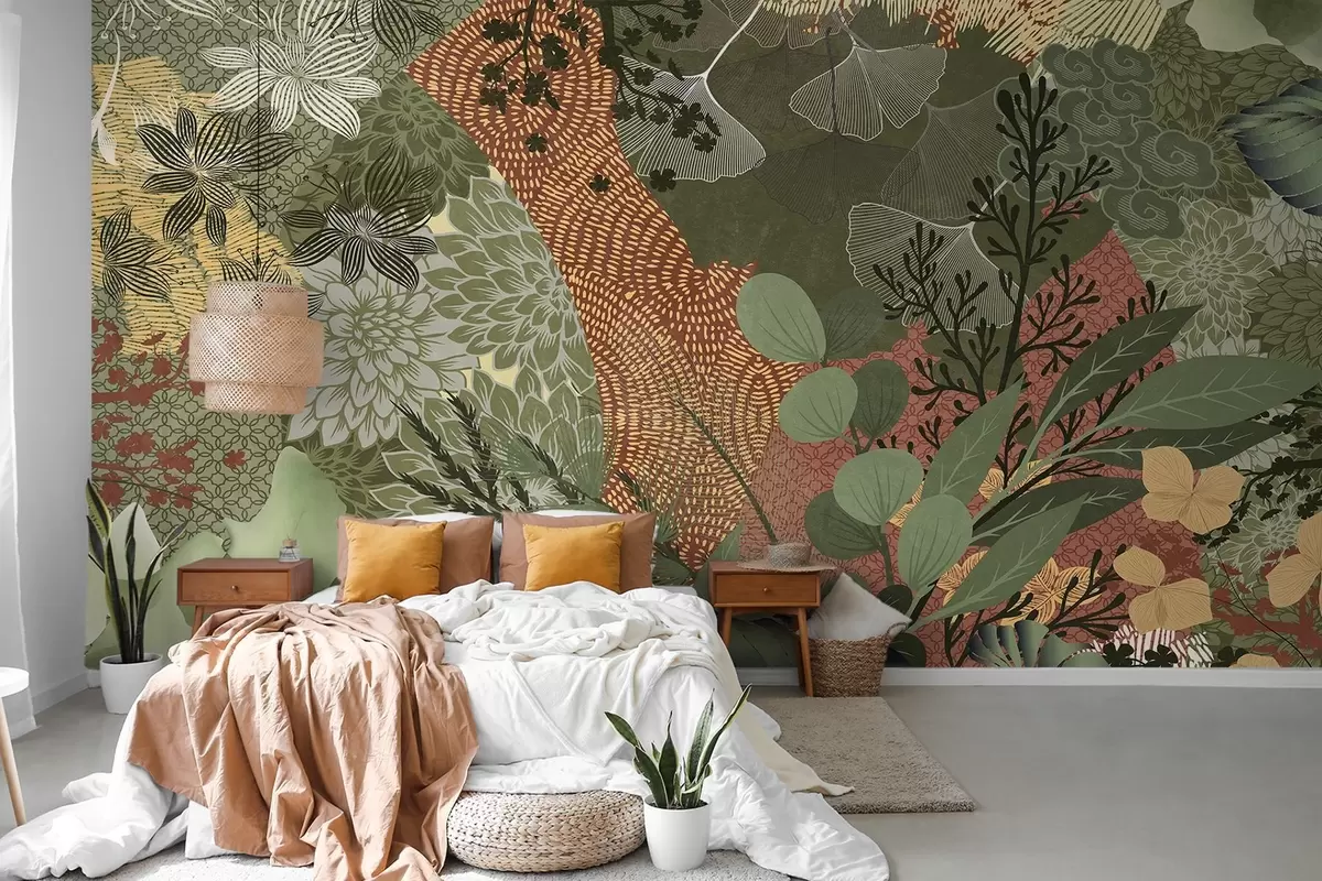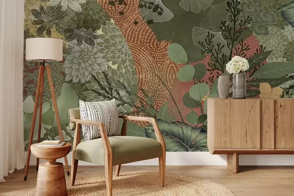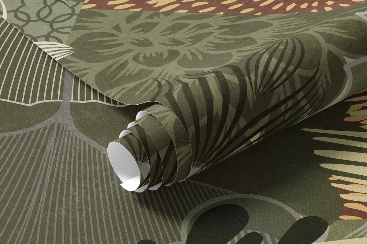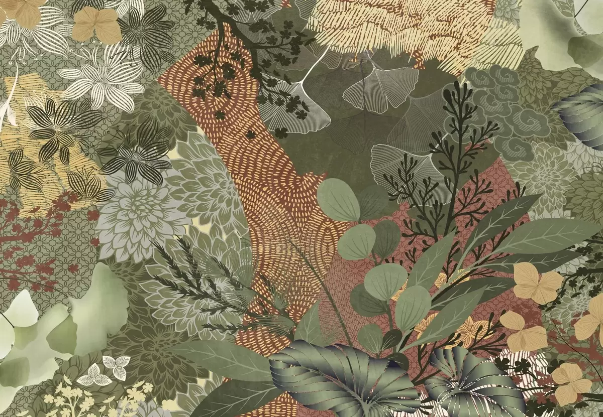 Fotomurales Collage abstracto con texturas de elementos botánicos, con hojas, flores y texturas orgánicas, en tonos verdes y marrones. Nr. w09545