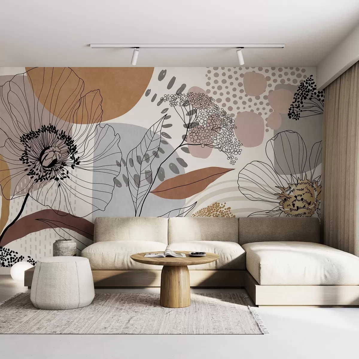 Fotomurales Estampado abstracto con textura floral, flores de trazo fino, hojas y formas orgánicas en tonos apagados de marrón, beige y gris. Nr. w09548