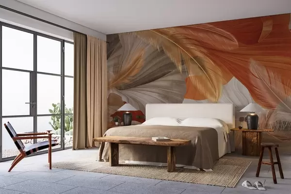 Fotomurales Formas abstractas grandes y fluidas con textura en colores crema y óxido con delicadas plumas amarillas, beige y marrones. Nr. w09549