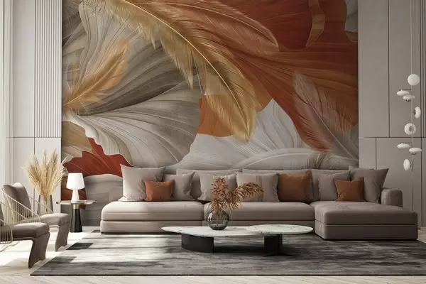Fotomurales Formas abstractas grandes y fluidas con textura en colores crema y óxido con delicadas plumas amarillas, beige y marrones. Nr. w09549