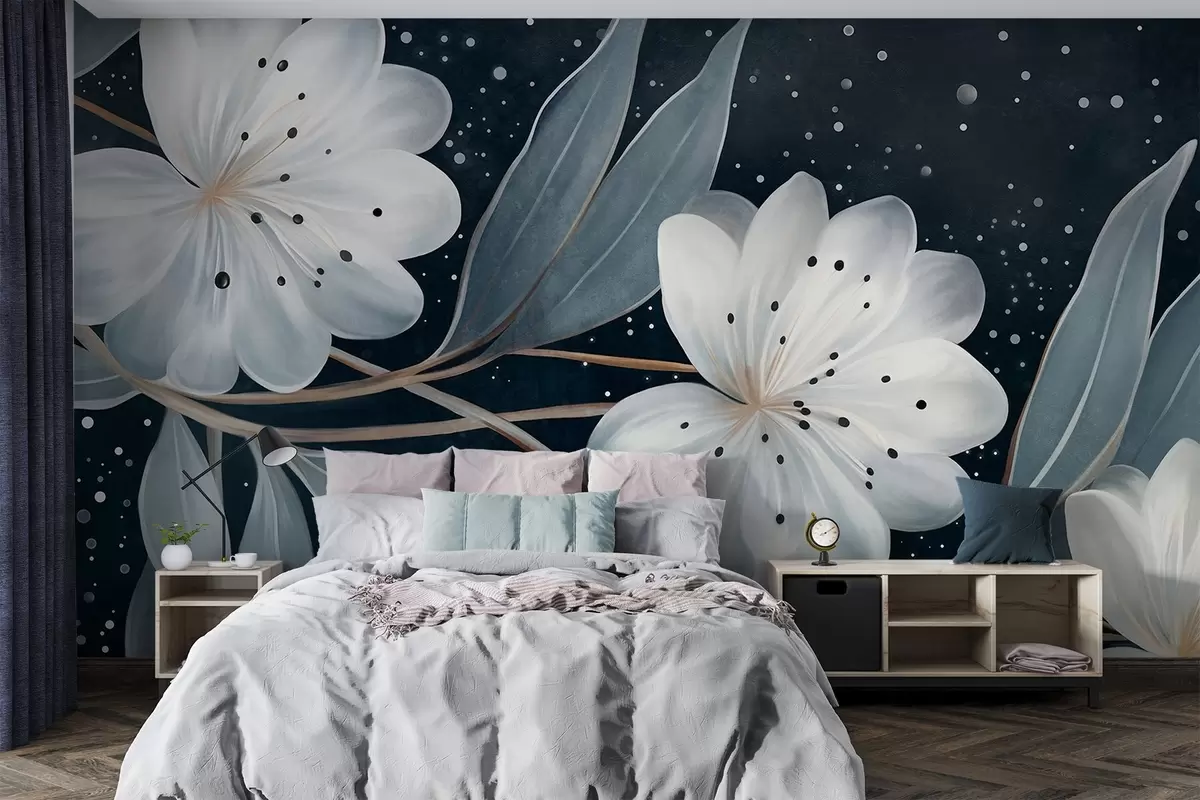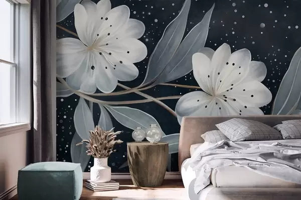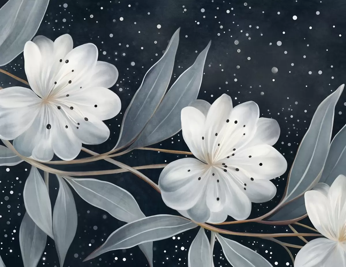 Fotomurales Flores blancas con textura fantástica, rodeadas de hojas y ramas azul verdosas sobre un fondo oscuro. Nr. w09551