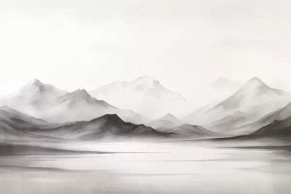 Fotomurales Un paisaje monocromático con textura, montañas brumosas y un lago en primer plano. Nr. w09555