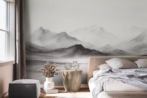 Fotomurales Un paisaje monocromático con textura, montañas brumosas y un lago en primer plano. Nr. w09555