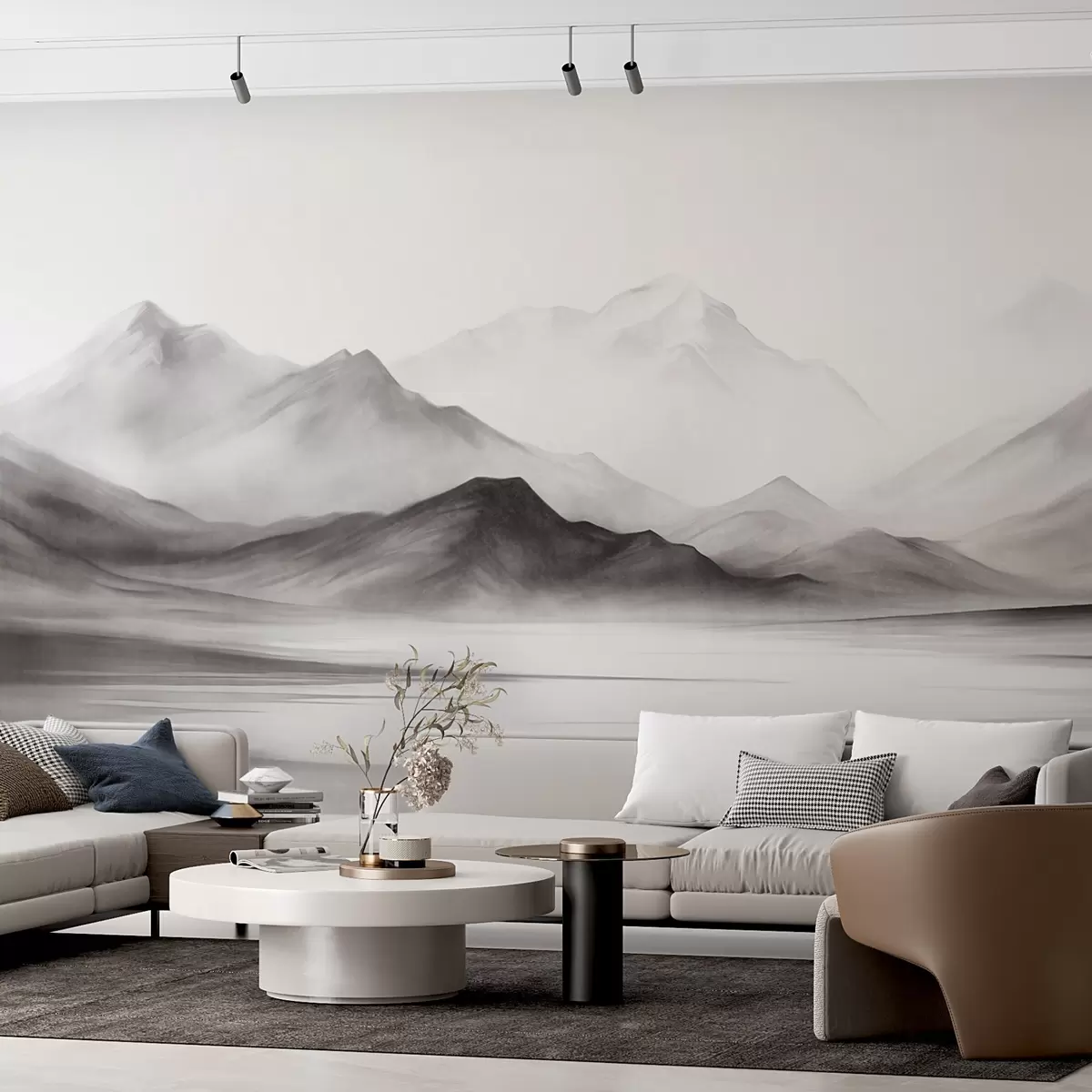 Fotomurales Un paisaje monocromático con textura, montañas brumosas y un lago en primer plano. Nr. w09555