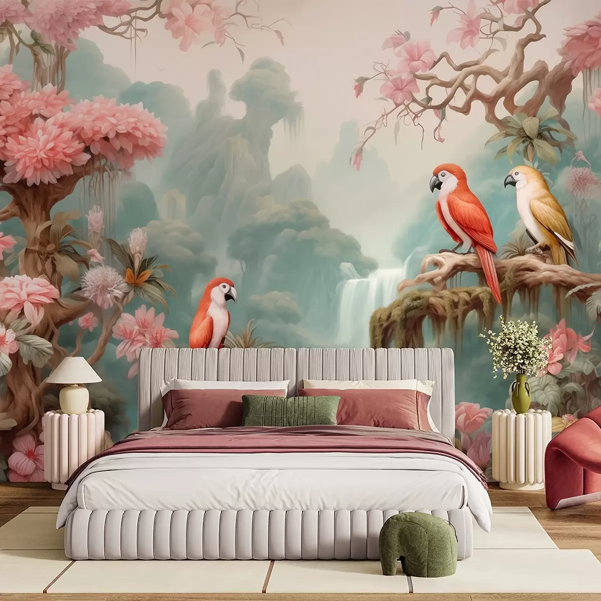 Fotomurales Un bosque tropical de cuento de hadas con loros, árboles en flor con flores rosas y una cascada. Nr. w09580