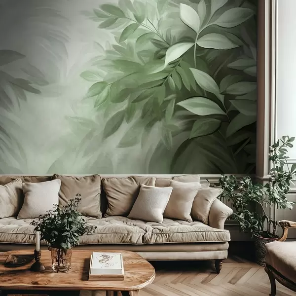 Fotomurales Hojas verdes y grises con un follaje de textura suave y difuminada, en un estilo pictórico con pinceladas visibles. Nr. w09584v1