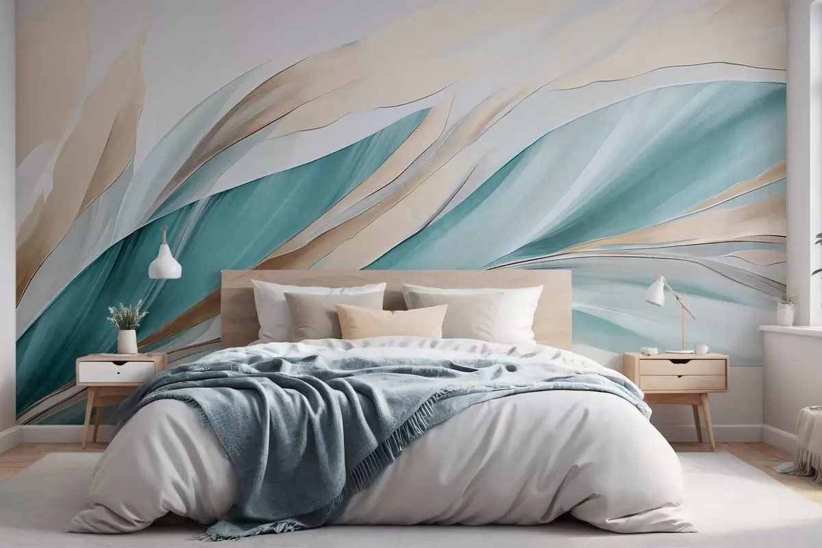 Fotomurales Ondas abstractas fluidas de color verde azulado y amarillo, con formas y líneas finas, sobre un fondo blanco, arte texturizado. Nr. w09585