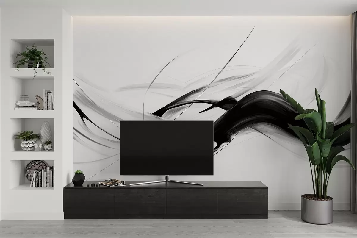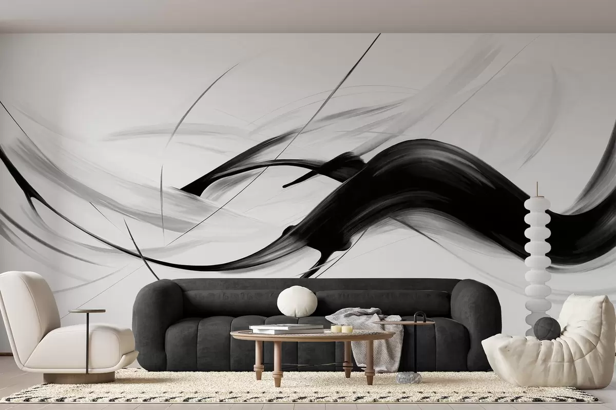 Fotomurales Pinceladas abstractas en blanco y negro con líneas finas que crean un diseño moderno sobre un fondo claro. Nr. w09605