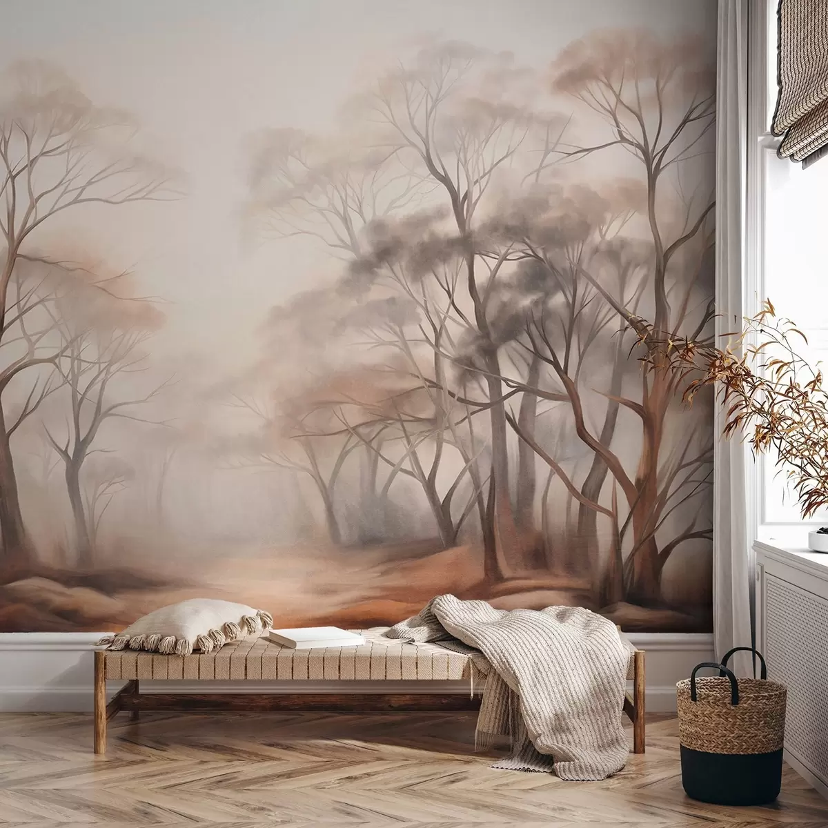 murales de pared Árboles con textura en un bosque brumoso, paisaje neblinoso con colores apagados y suave iluminación. w09609