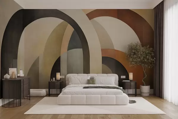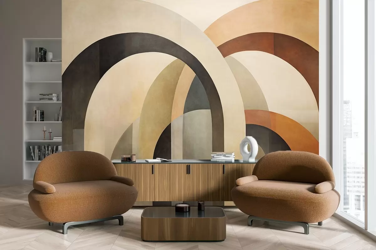 Fotomurales Arcos geométricos abstractos con textura en tonos tierra de beige, marrón y gris, un diseño arquitectónico moderno en capas. Nr. w09611