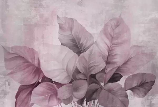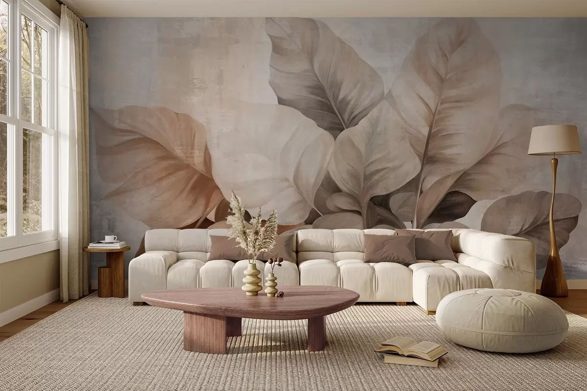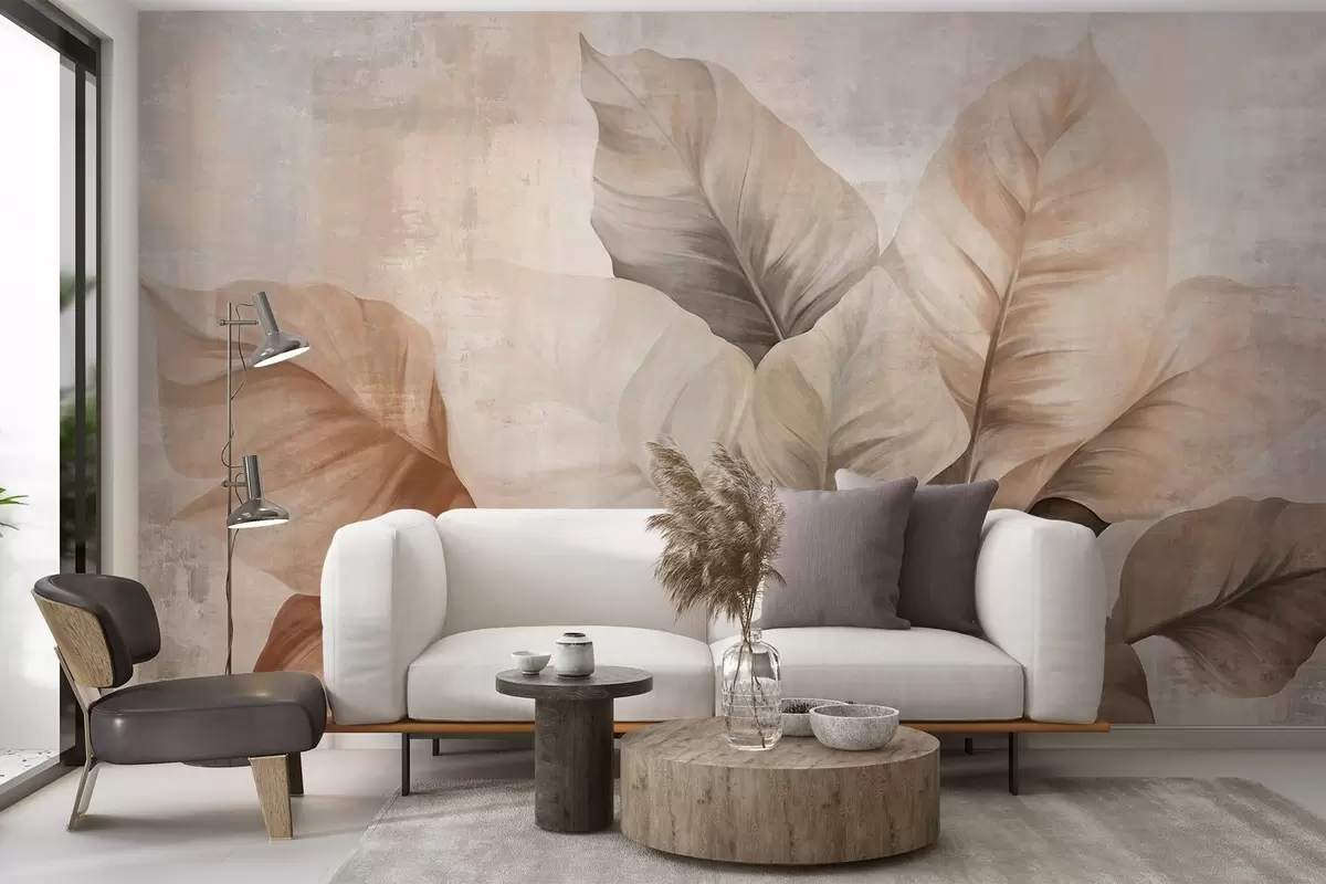 Fotomurales Imitacione de pintura texturizada de hojas grandes de color marrón claro sobre un fondo neutro con pinceladas sutiles. Nr. w09614