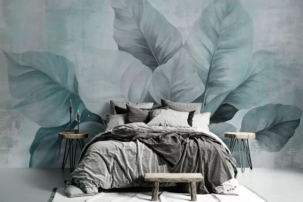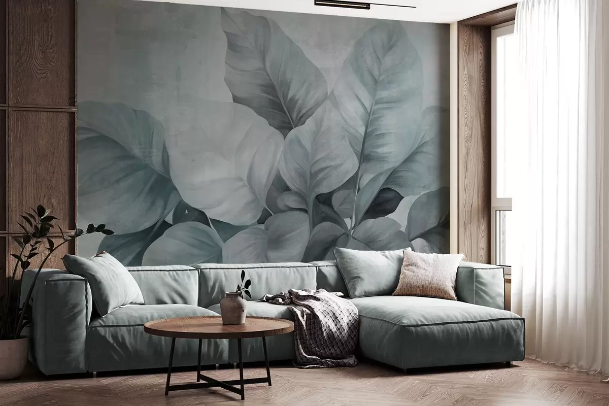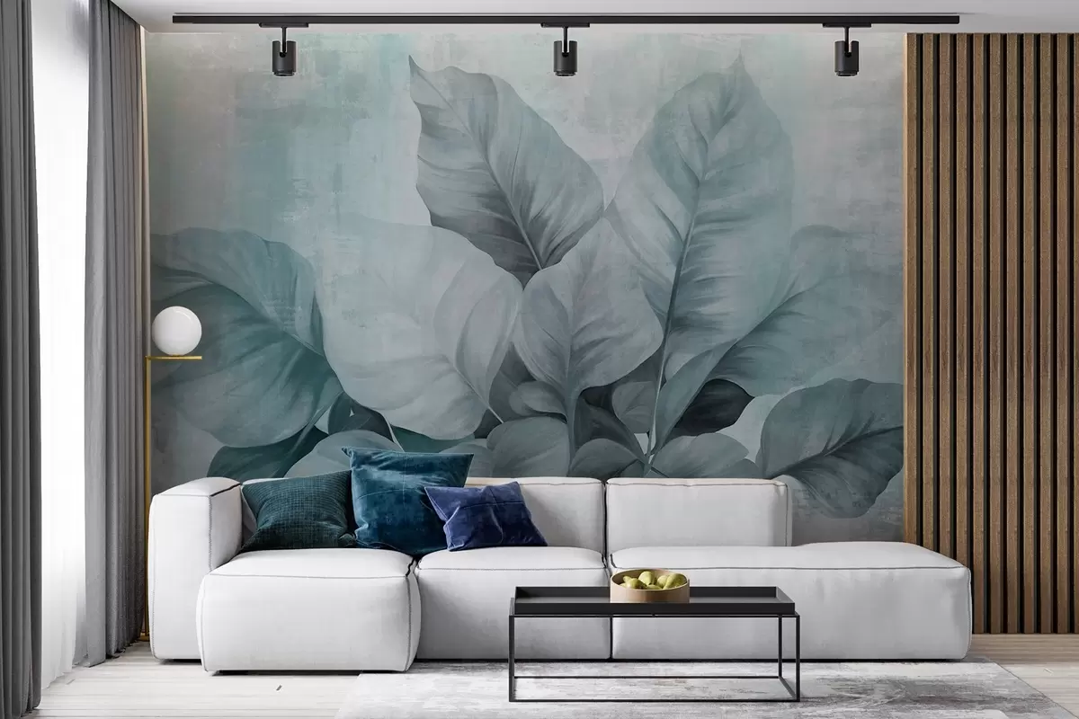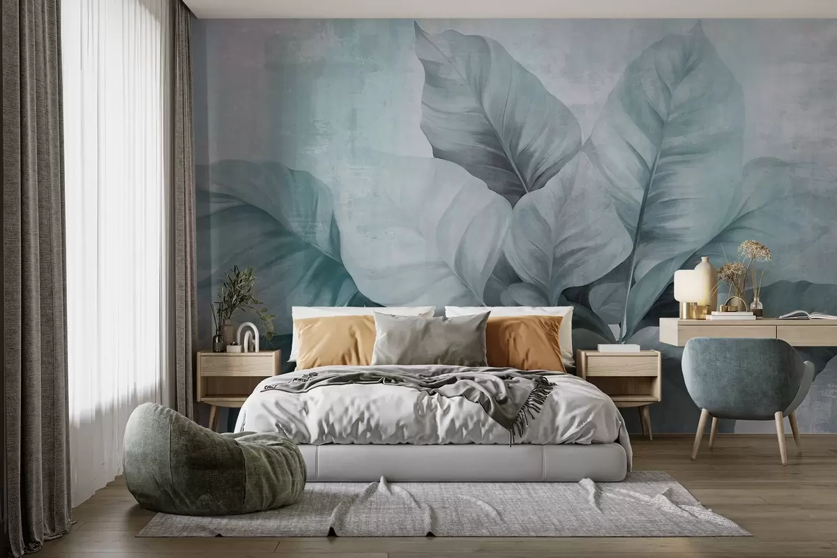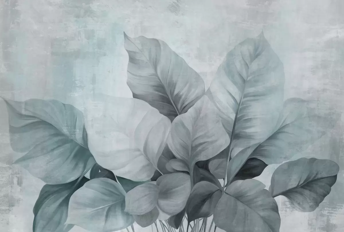 Fotomurales Pintura texturizada que imita hojas grandes de color azul claro sobre un fondo neutro con sutiles pinceladas. Nr. w09614v2
