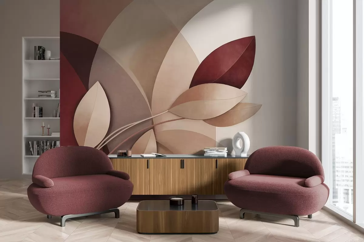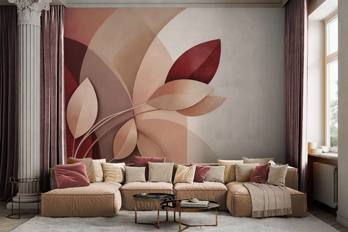 Fotomurales Rama abstracta con textura y hojas en tonos marrones, beige y rojos, sobre un fondo de formas abstractas. Nr. w09618