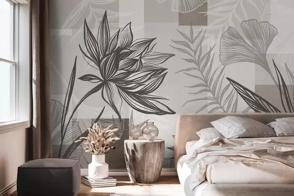 Fotomurales Flores y hojas estilizadas con textura en tonos marrones y beige, con un fondo geométrico, arte lineal. Nr. w09629