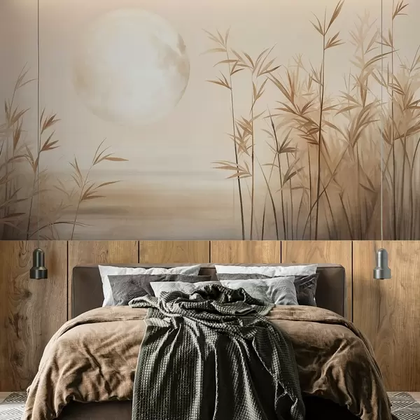 Fotomurales Paisaje texturizado con altos juncos, lago y luna pálida en un cielo brumoso. Nr. w09631