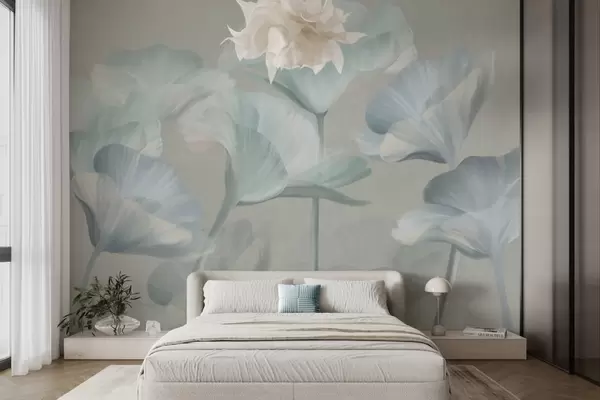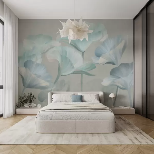 Fotomurales Flores de loto translúcidas de color turquesa pálido con pétalos delicados sobre un fondo gris apagado. Nr. w09640v2