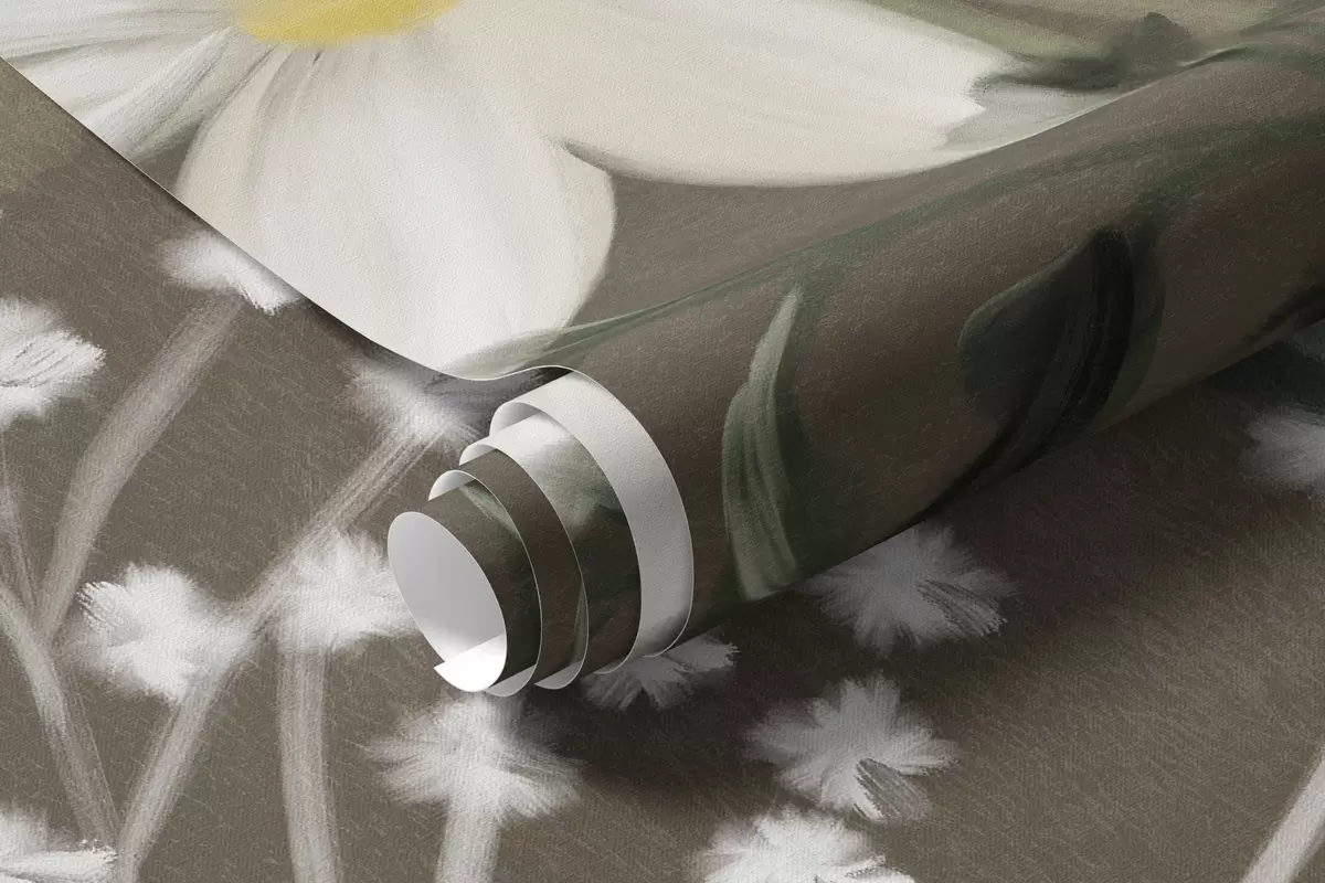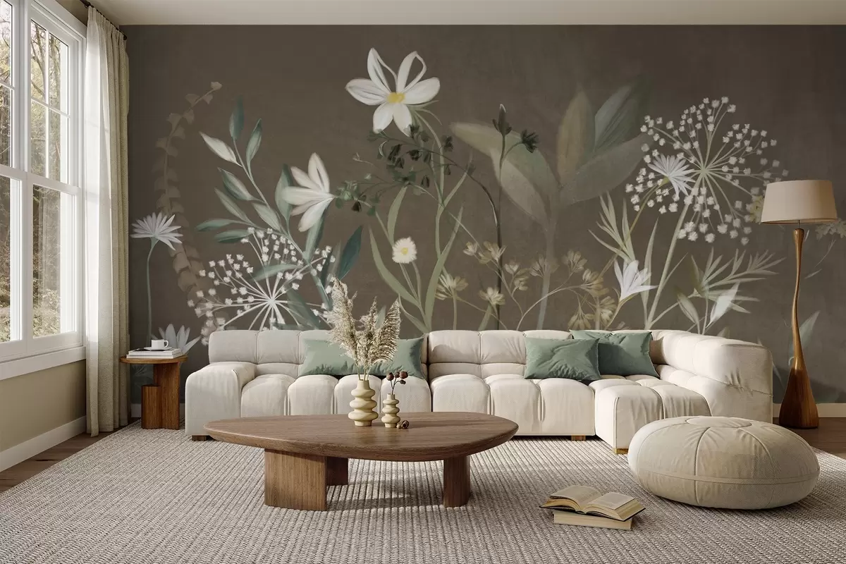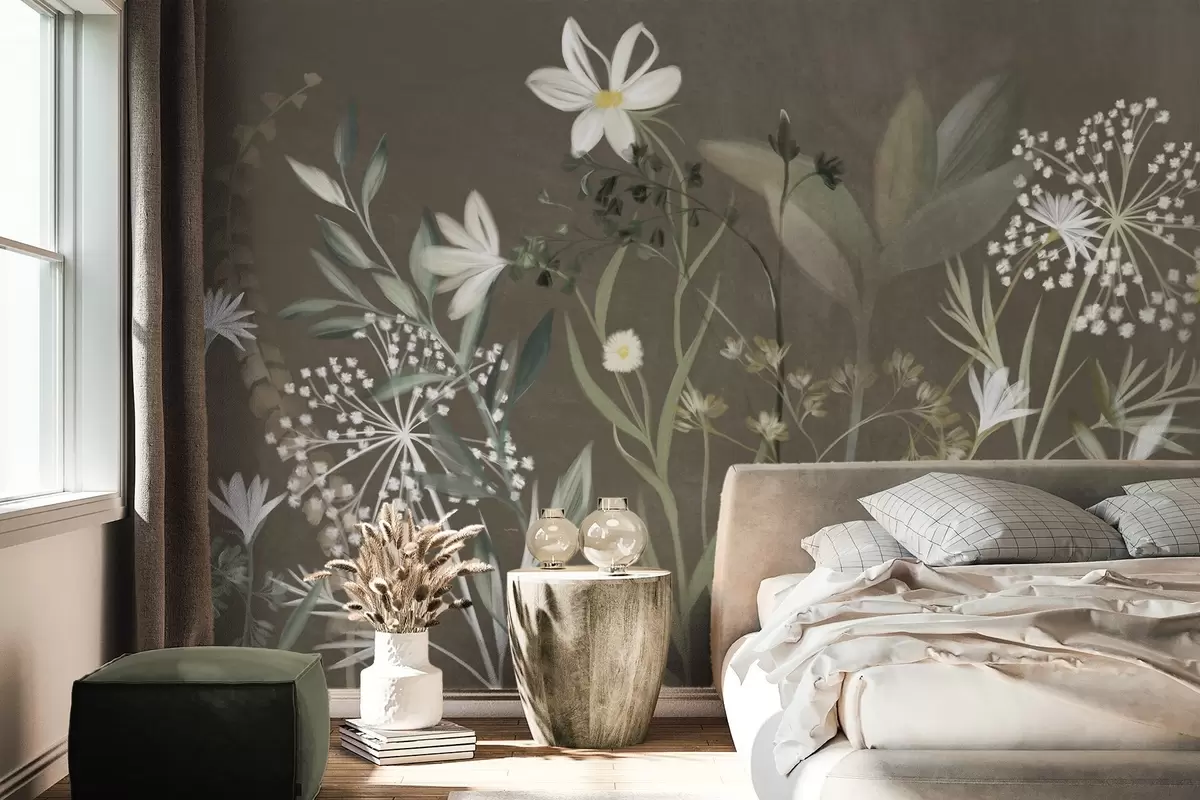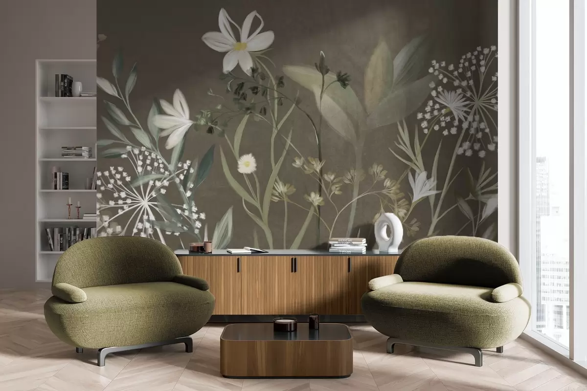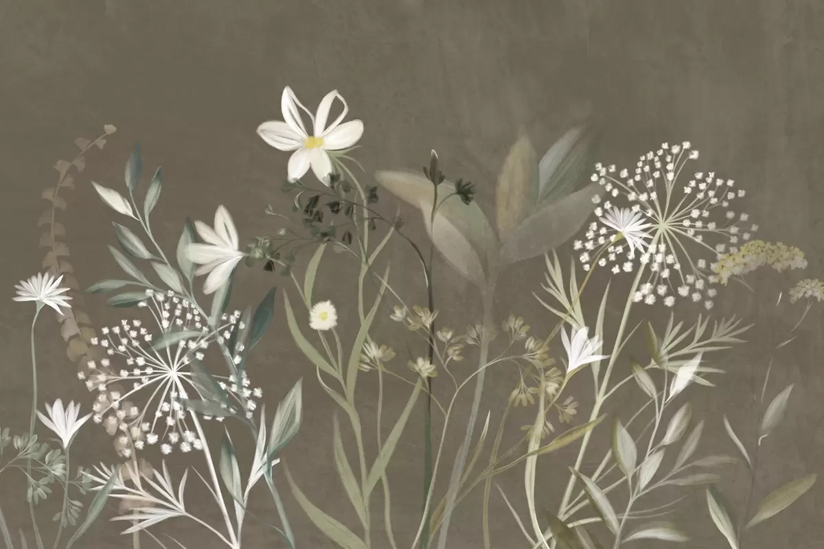Fotomurales Delicadas flores silvestres y follaje con textura en tonos verdes y crema apagados sobre un fondo marrón. Nr. w09641v1