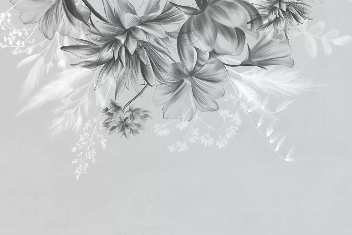 Fotomurales Flores y helechos texturizados en tonos gris oscuro y blanco sobre un fondo gris apagado, estilo de dibujo. Nr. w09644v1