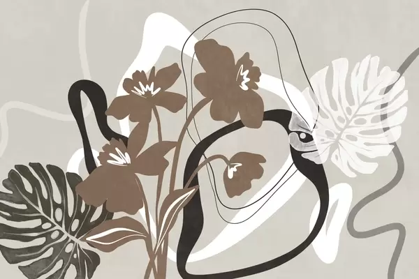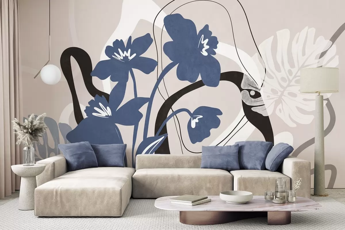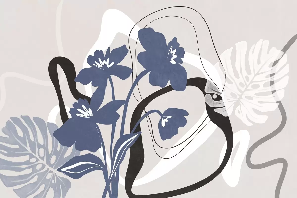 Fotomurales Flores azules abstractas con textura y formas blancas y negras sobre un fondo beige claro, arte minimalista. Nr. w09645