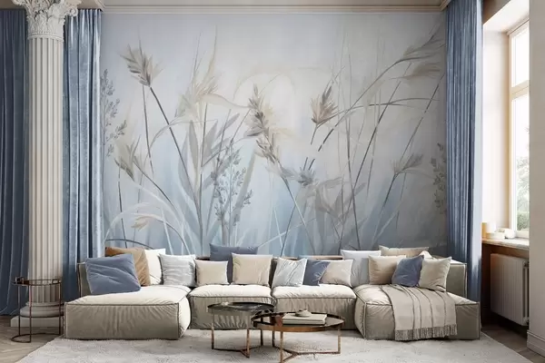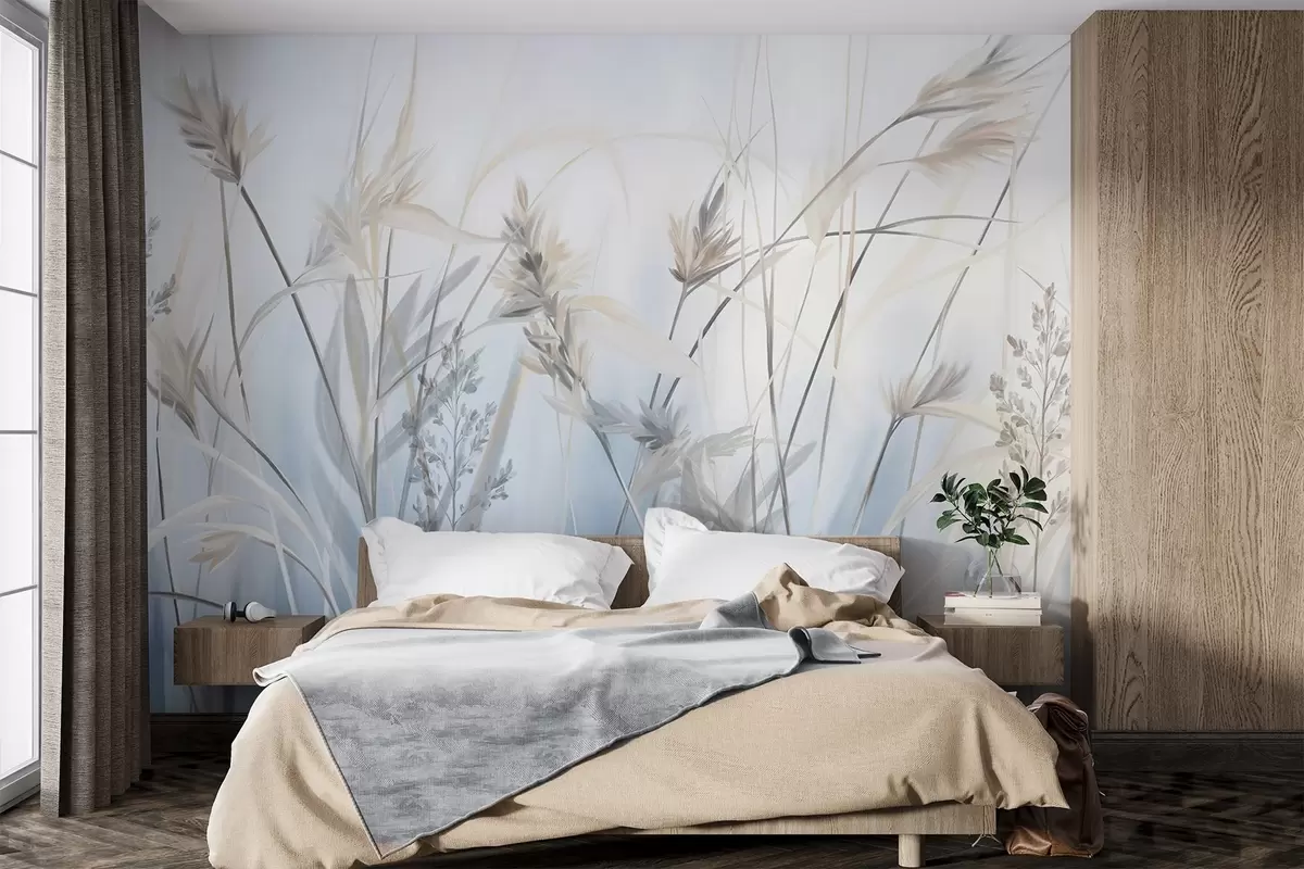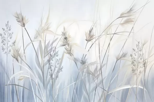 Fotomurales Tallos altos y secos de hierba con puntas plumosas en tonos apagados, fondo azul y blanco suave y difuminado. Nr. w09652