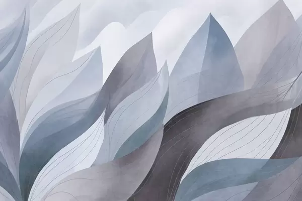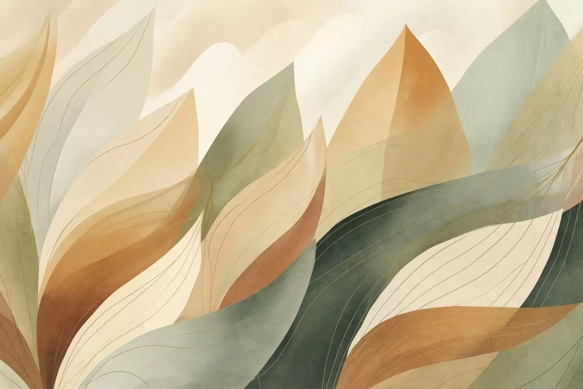 Fotomurales Hojas abstractas, tonos tierra apagados de verde y naranja con delicados detalles lineales, textura suave de acuarela. Nr. w09736