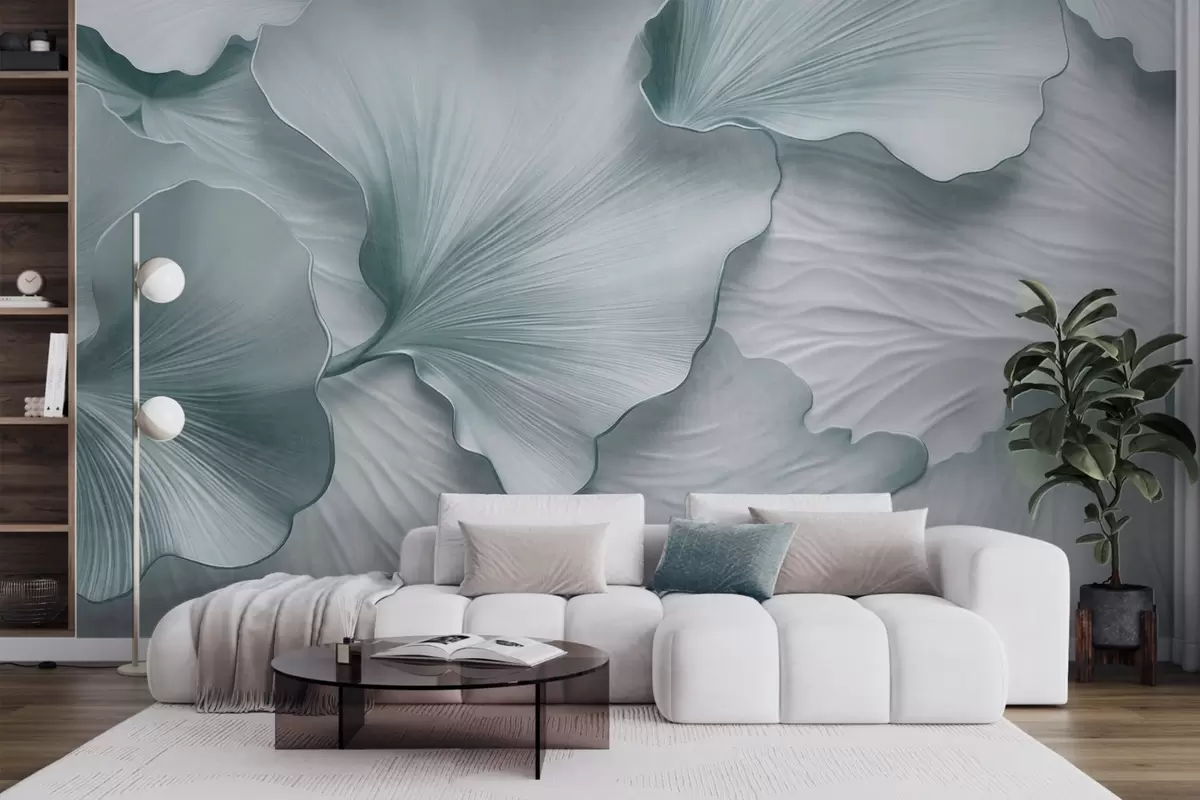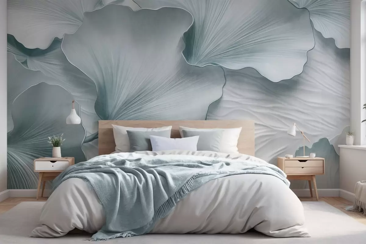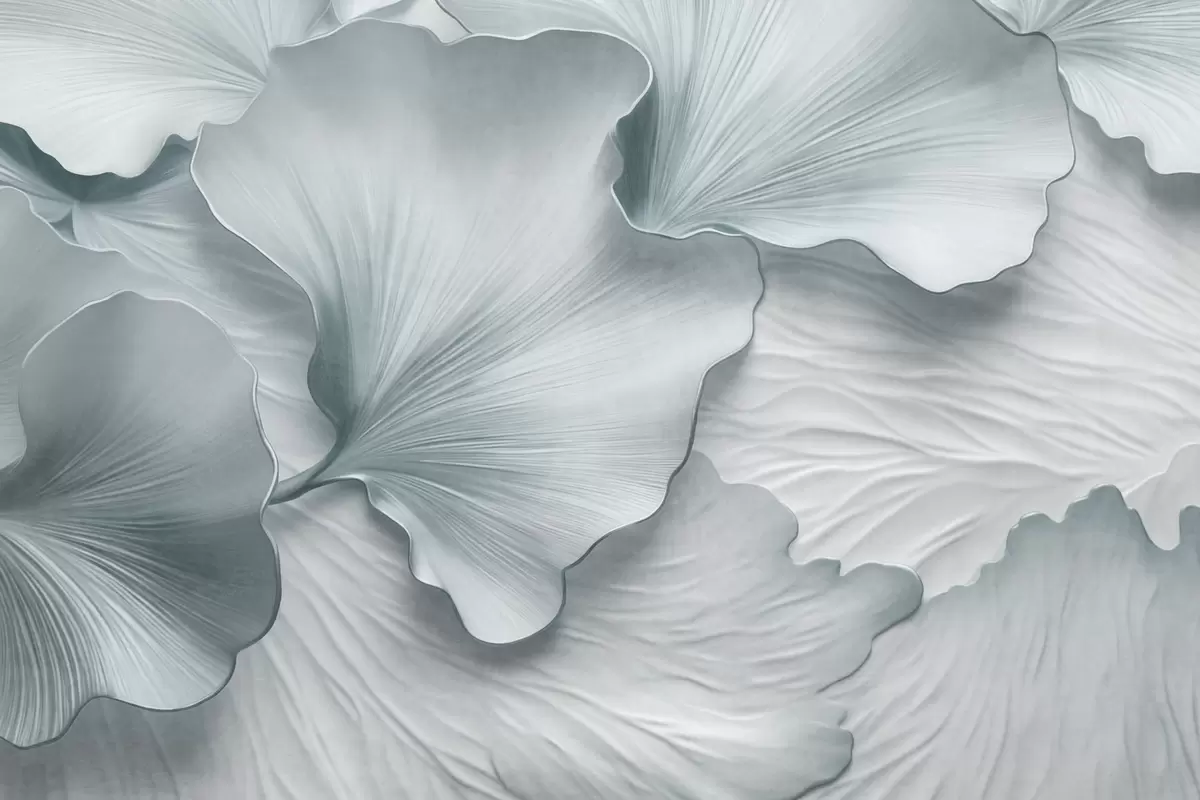 Fotomurales Pétalos de hojas de ginkgo texturizados, azules y blancos, con un delicado estampado orgánico. Nr. w09741v1
